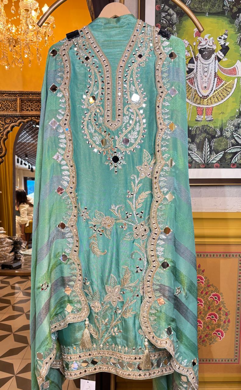 • Shimmer Organza Shirt with Handcrafted Mirror Work on Neckline – 2.5 meters