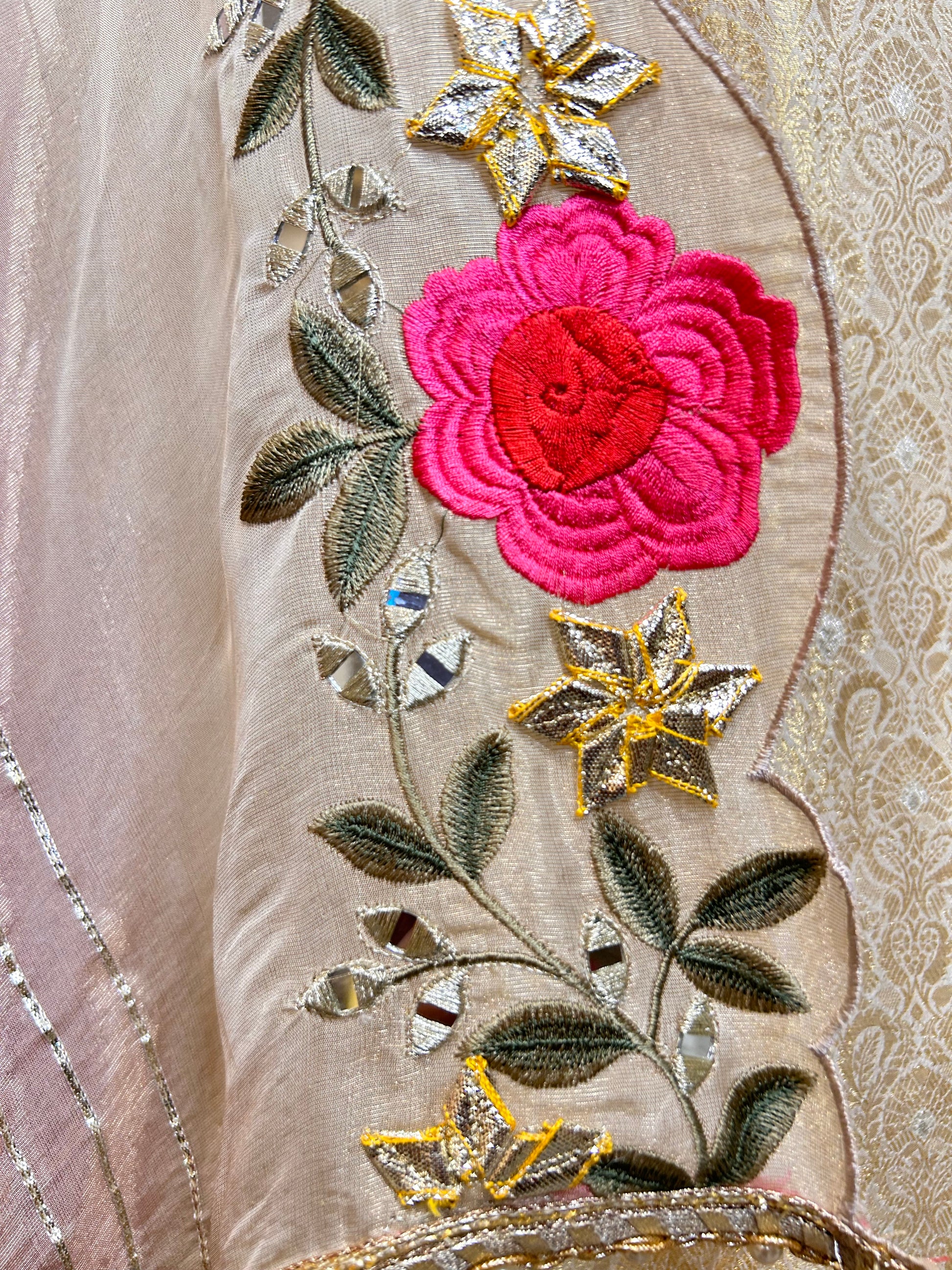 Intricately woven Banarasi brocade adorned with gotapatti detailing at the neckline and elaborate embroidery along the ghera—radiating royal finesse.
