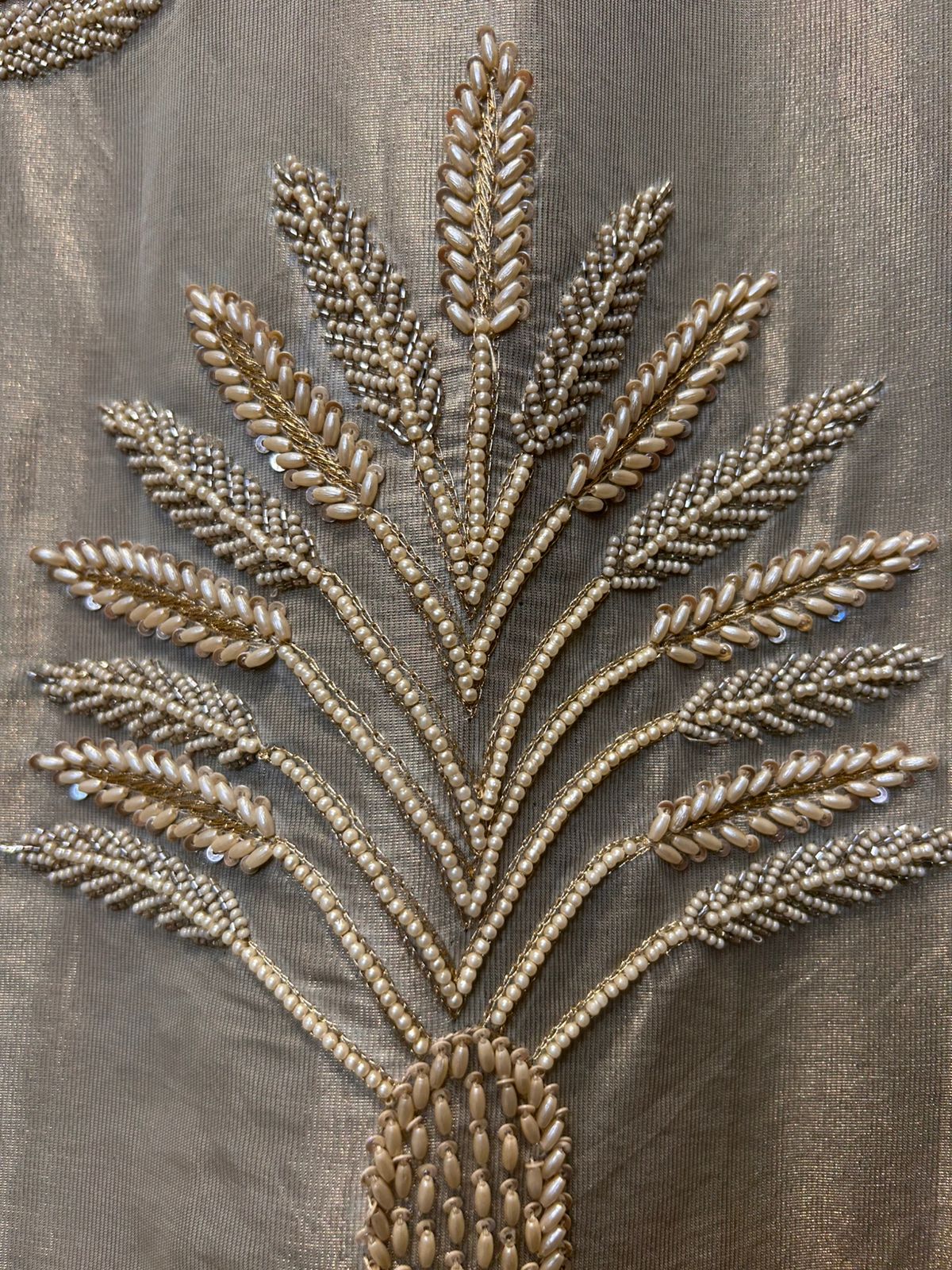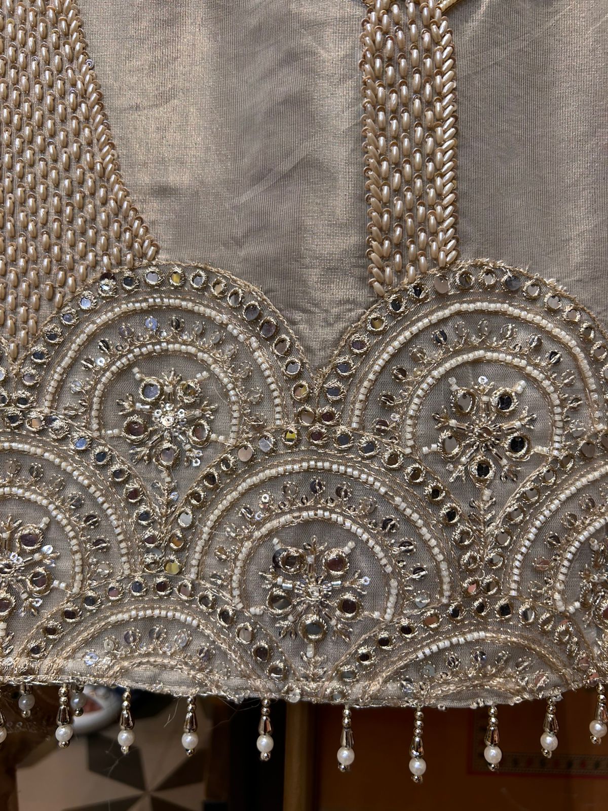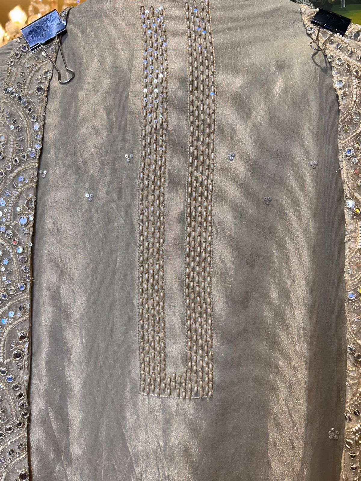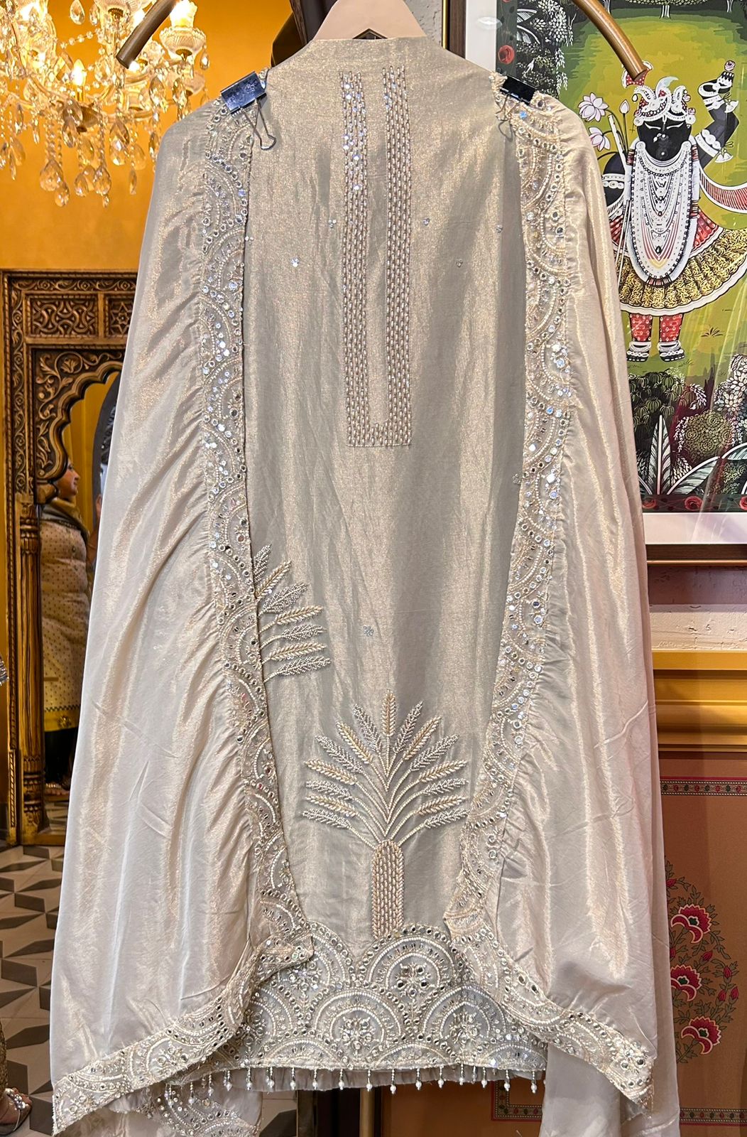 An ode to timeless artistry, this ensemble weaves together shimmer, handcraft, and delicate embellishments. The shimmer organza shirt, accentuated with mirror and moti work, captures the light beautifully while celebrating intricate detailing. Paired with a graceful shimmer organza dupatta featuring a refined four-side border, and a smooth silk bottom, this set is the perfect blend of grandeur and elegance.