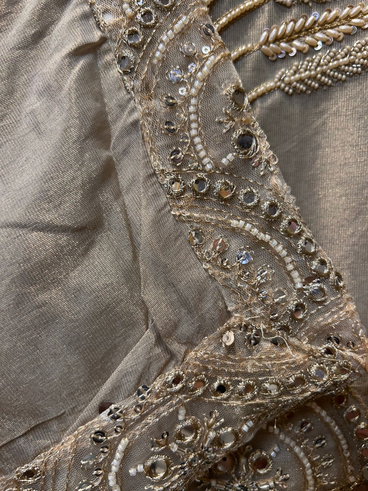 - Shimmer Organza Shirt (2.5 mtrs) – Enhanced with handwork, mirror accents, and moti detailing for subtle sparkle.