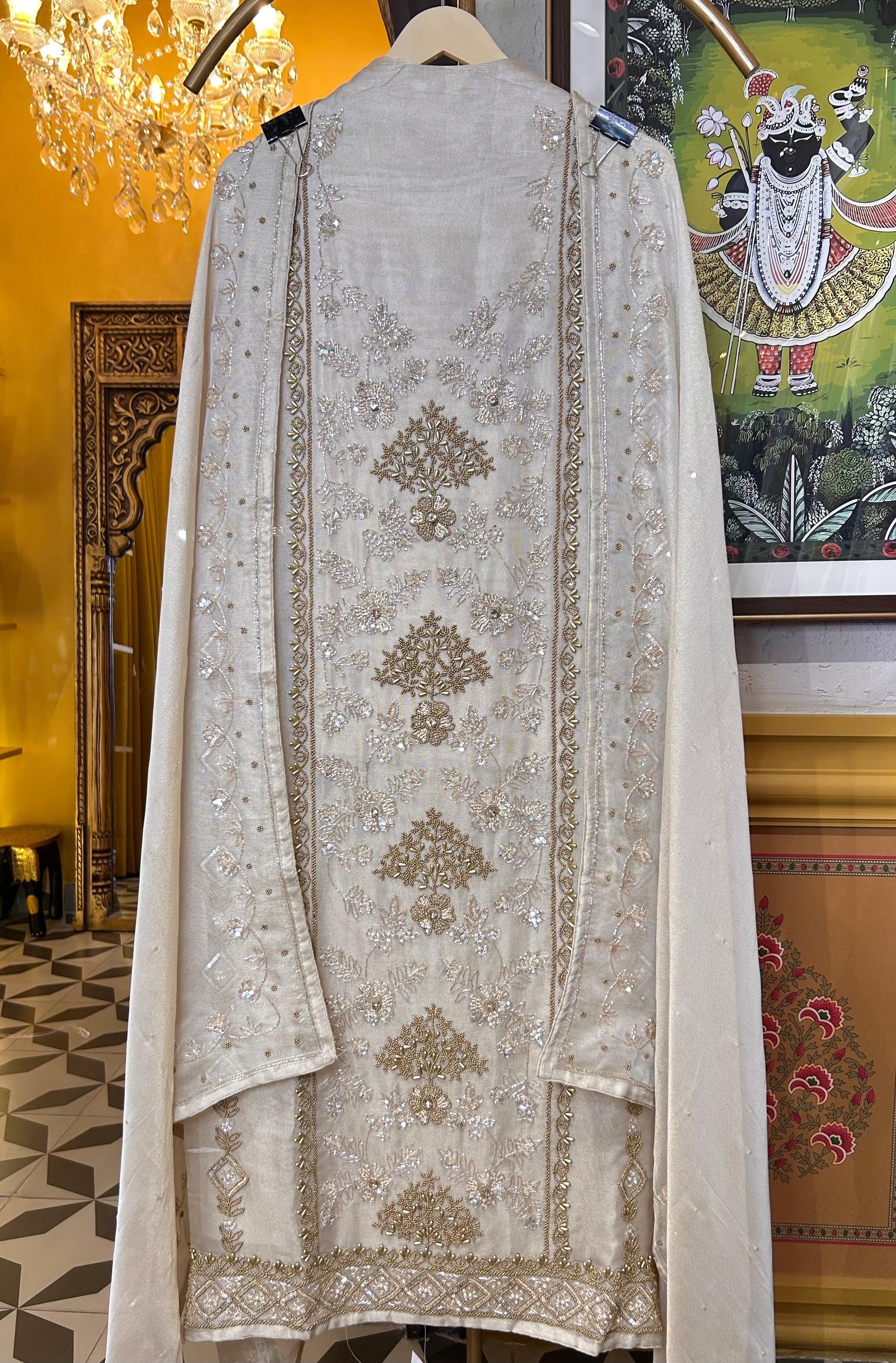 The Noor-e-Moti Set marries the ethereal sheen of shimmer organza with intricate handwork, adorned delicately with moti embellishments—bringing quiet grandeur to any occasion.