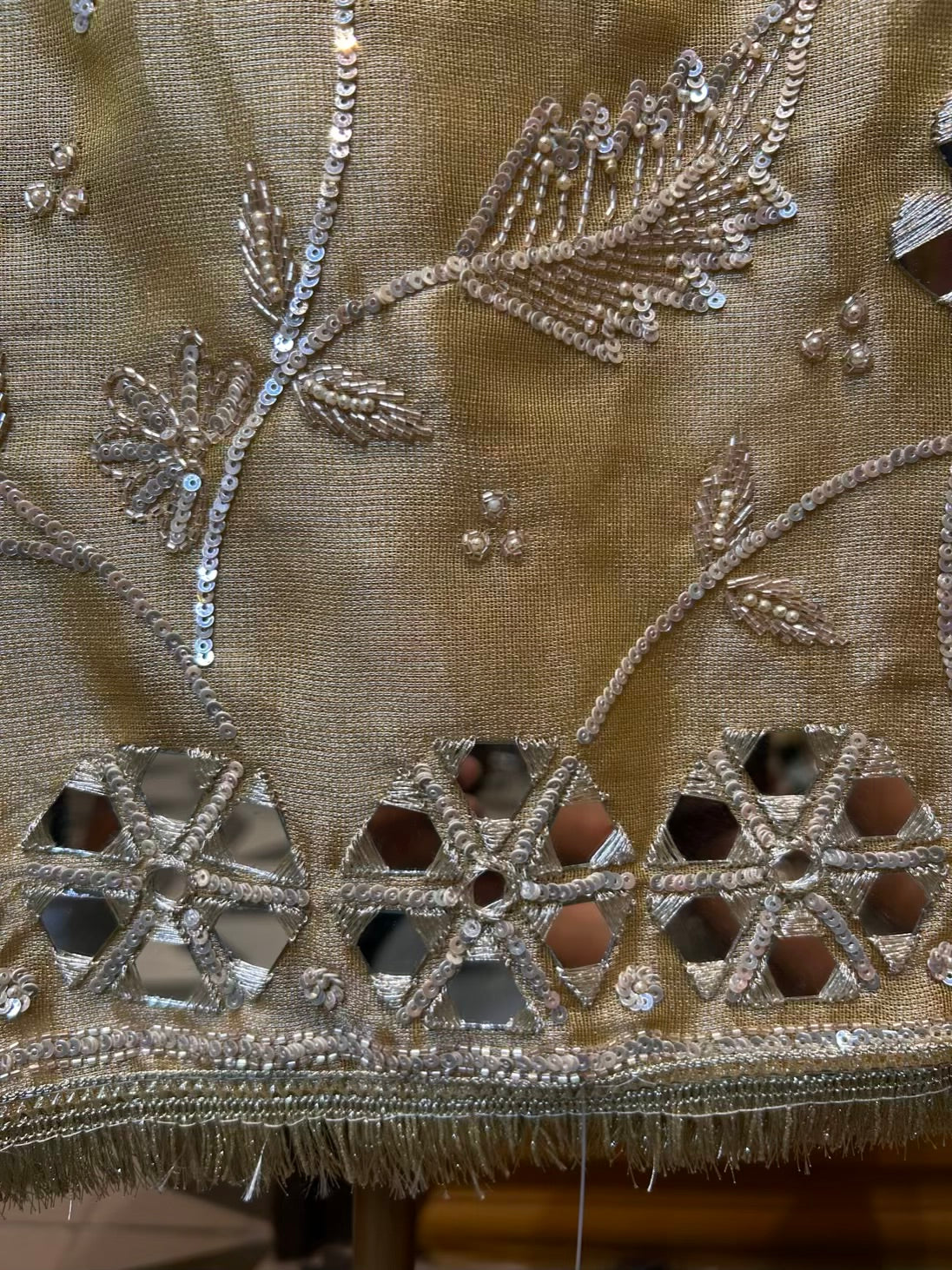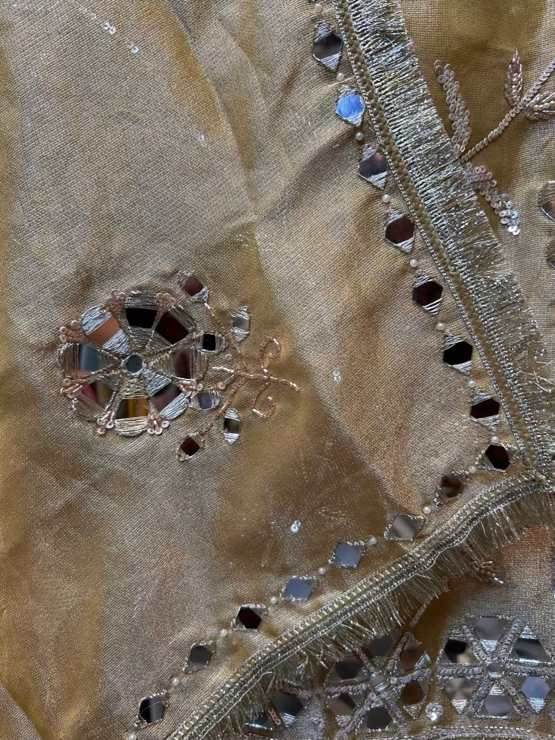 • Shimmer Organza Dupatta (2.25 mtrs) – Detailed with four-side mirror work and finished with Kiran Kinari lace.