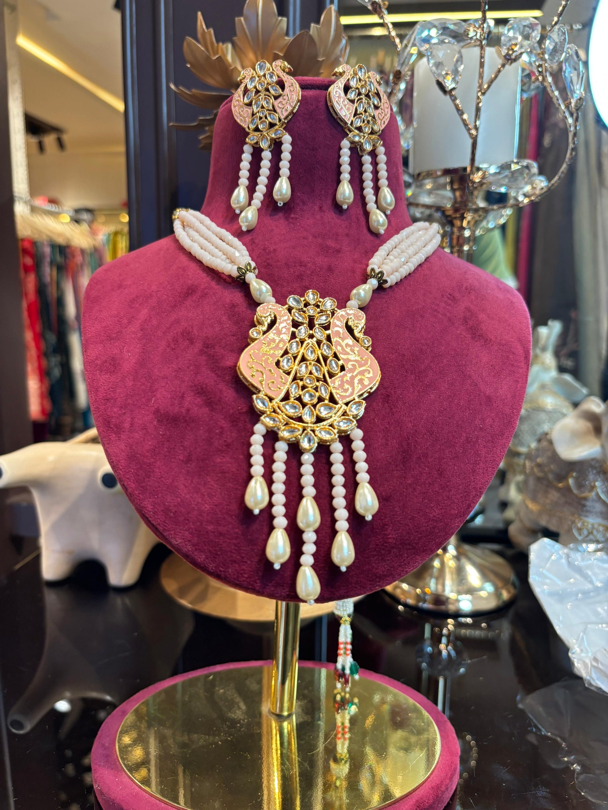 The soft enamel detailing and luminous pearl strands bring fluidity and sophistication to the piece, while the statement earrings echo its refined grandeur. A perfect balance of tradition and artistry, this set celebrates beauty that never fades.