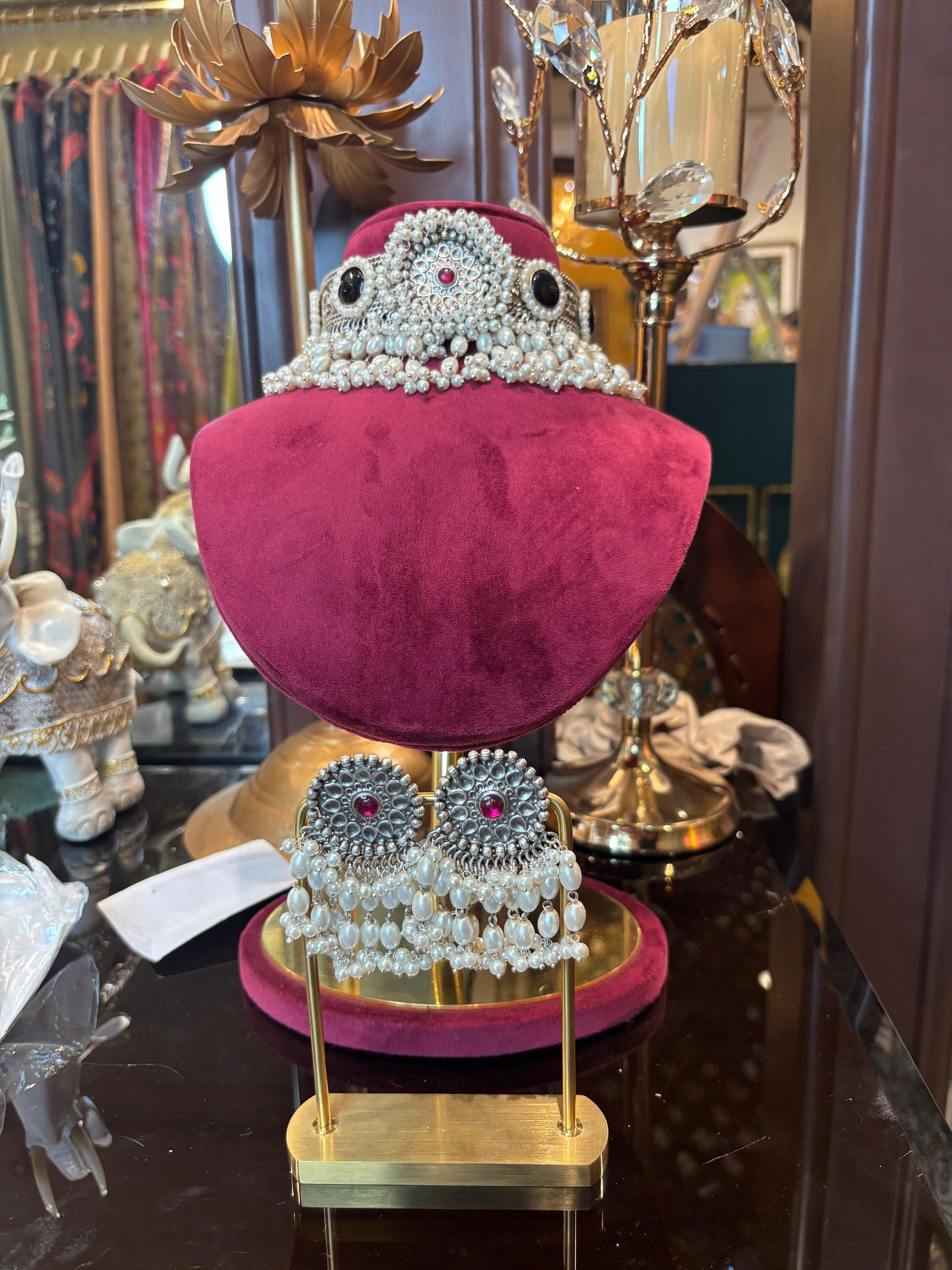 A masterpiece of vintage grandeur — the Nooré-Moti Choker Set brings together regal charm and artisanal intricacy. Crafted with oxidized silver detailing, clusters of lustrous pearls, and a striking gemstone centerpiece, it embodies heritage elegance with a modern allure. Paired with cascading pearl chandbaalis, this set radiates timeless sophistication.