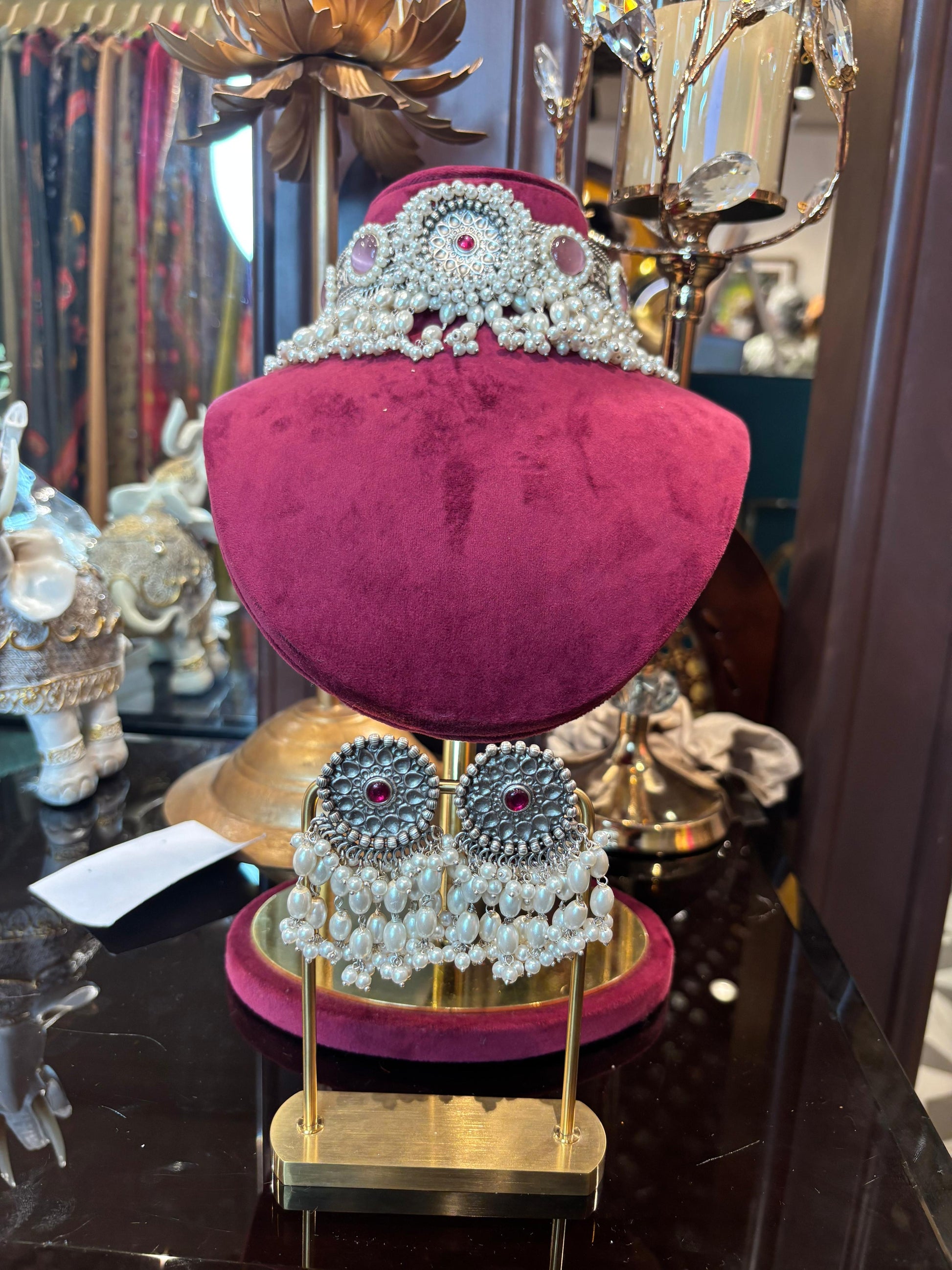 A masterpiece of vintage grandeur — the Nooré-Moti Choker Set brings together regal charm and artisanal intricacy. Crafted with oxidized silver detailing, clusters of lustrous pearls, and a striking gemstone centerpiece, it embodies heritage elegance with a modern allure. Paired with cascading pearl chandbaalis, this set radiates timeless sophistication.