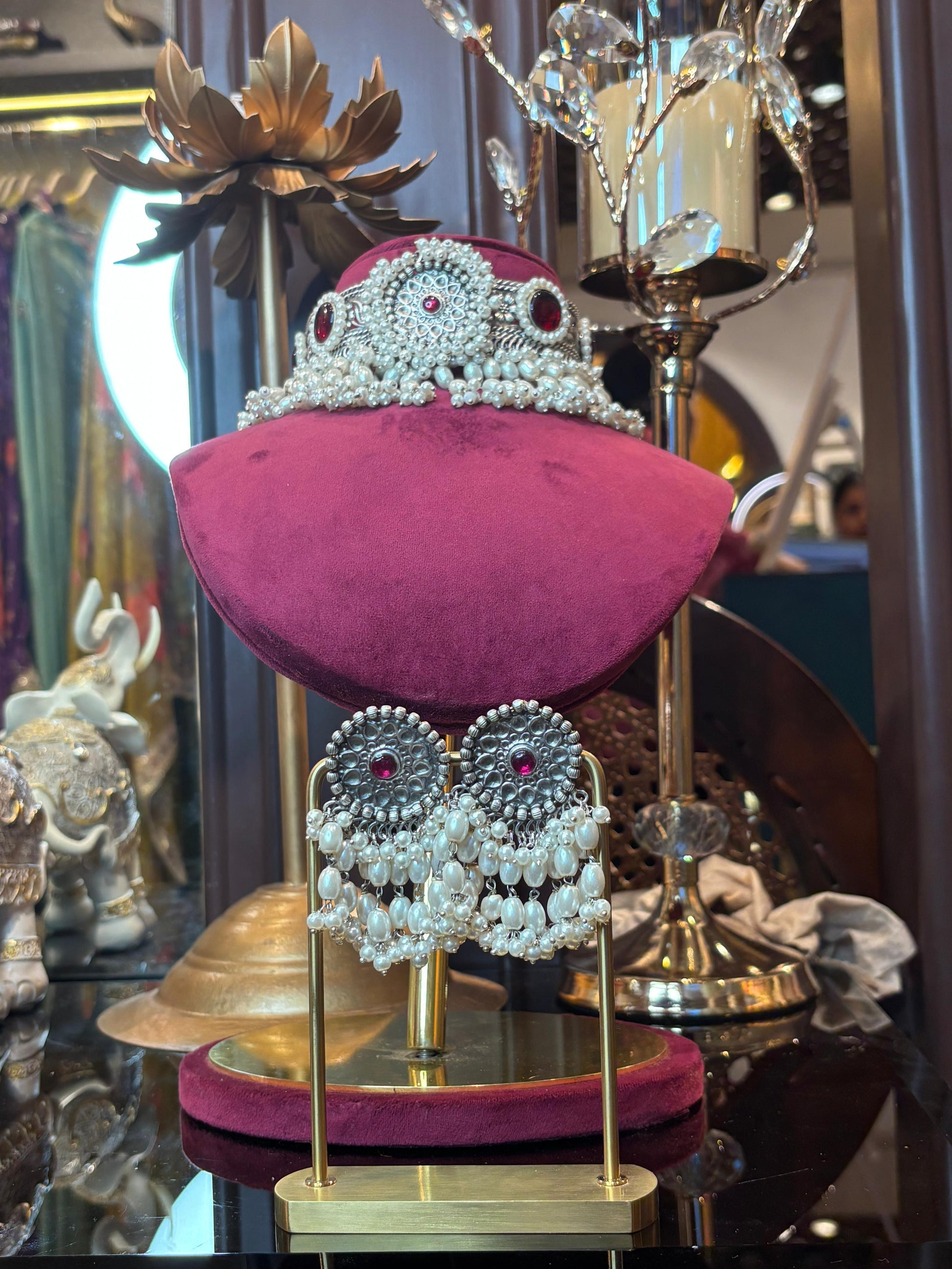 A masterpiece of vintage grandeur — the Nooré-Moti Choker Set brings together regal charm and artisanal intricacy. Crafted with oxidized silver detailing, clusters of lustrous pearls, and a striking gemstone centerpiece, it embodies heritage elegance with a modern allure. Paired with cascading pearl chandbaalis, this set radiates timeless sophistication.