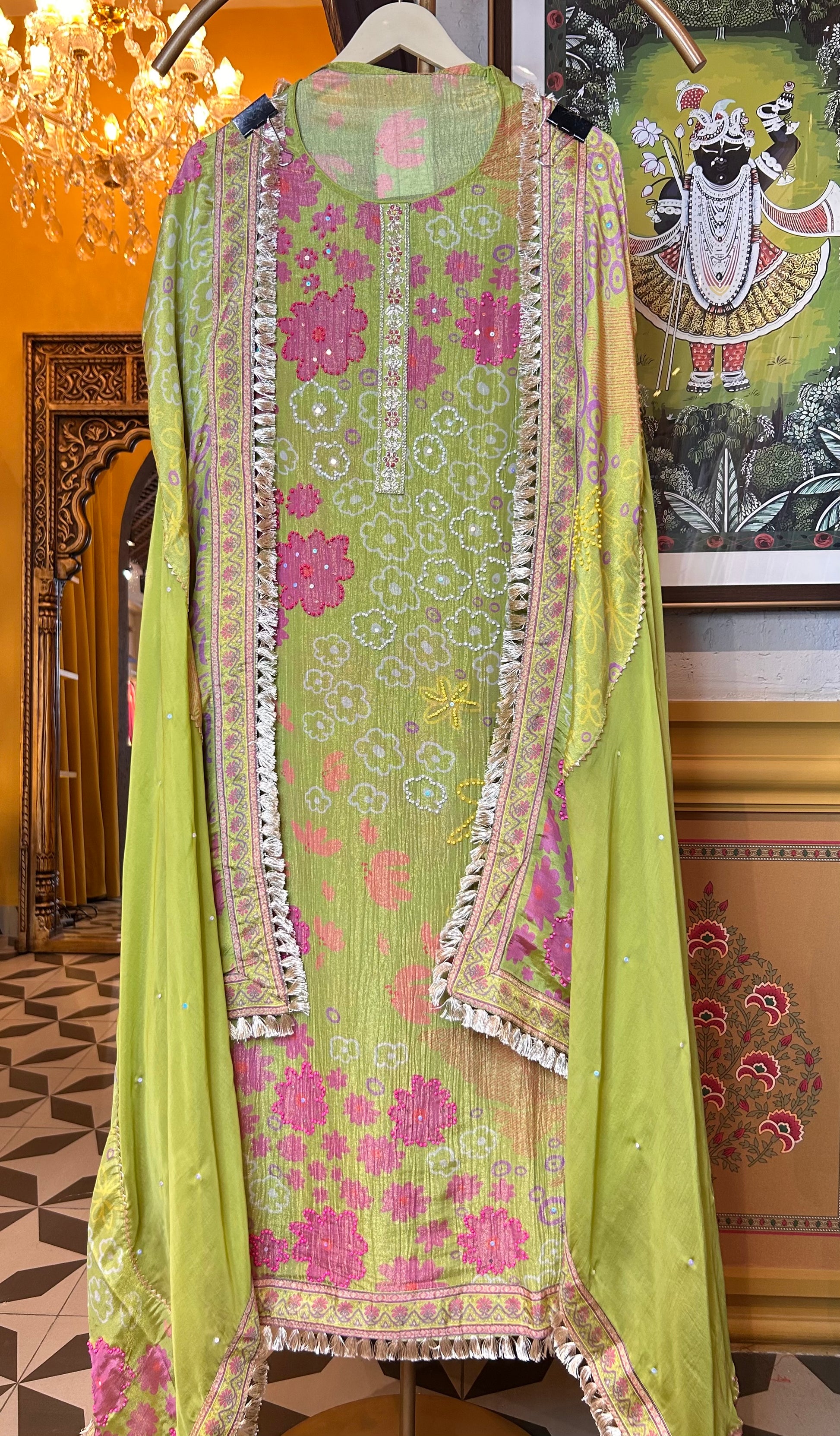 - Crush Tissue Digital Printed Shirt (2.5 mtr): Embellished with delicate Moti work, lending it a soft, radiant appeal.