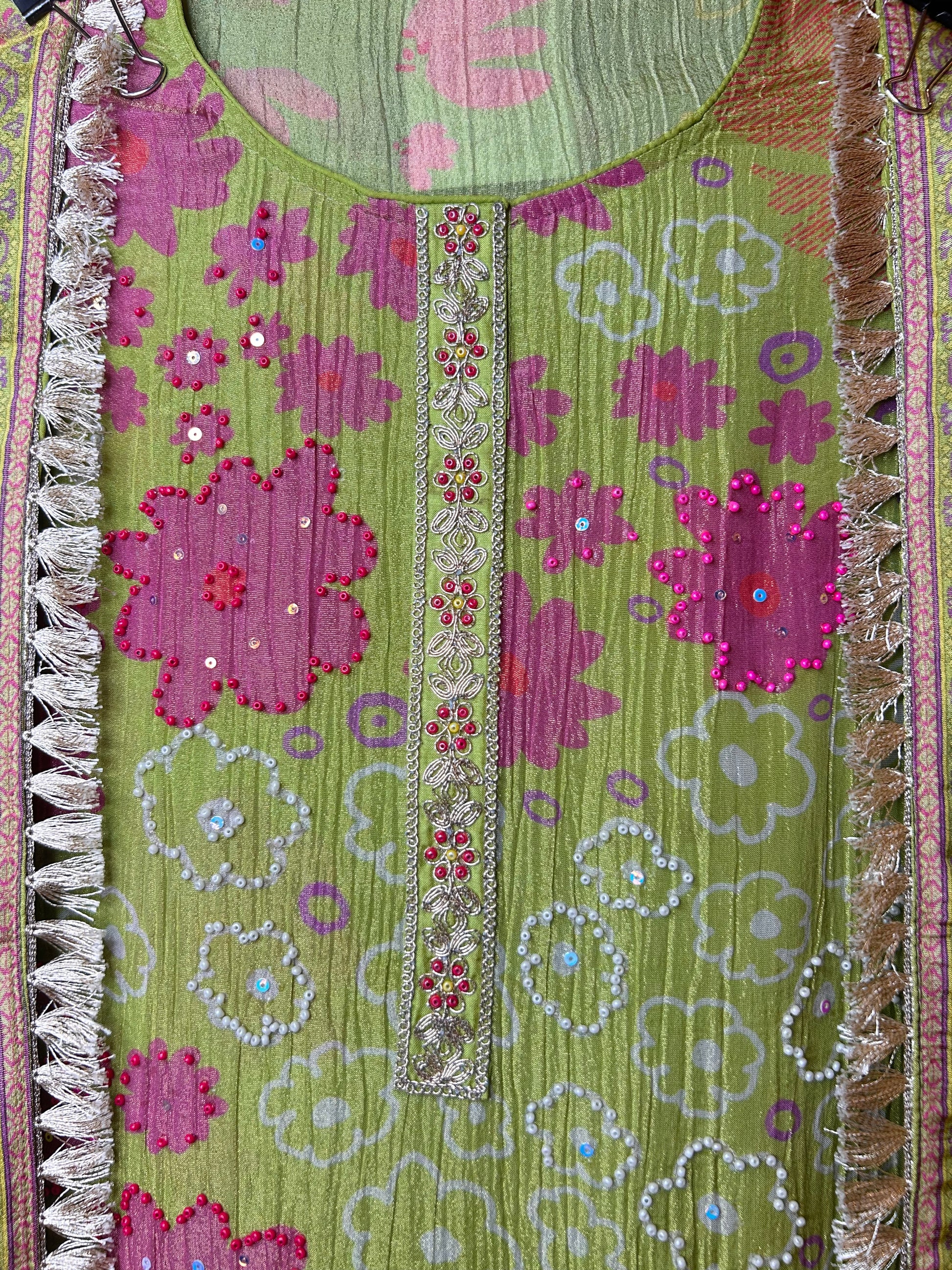 - Organza Digital Printed Dupatta (2.25 mtr): Adorned with elegant Moti work, creating a dreamy drape full of grace.