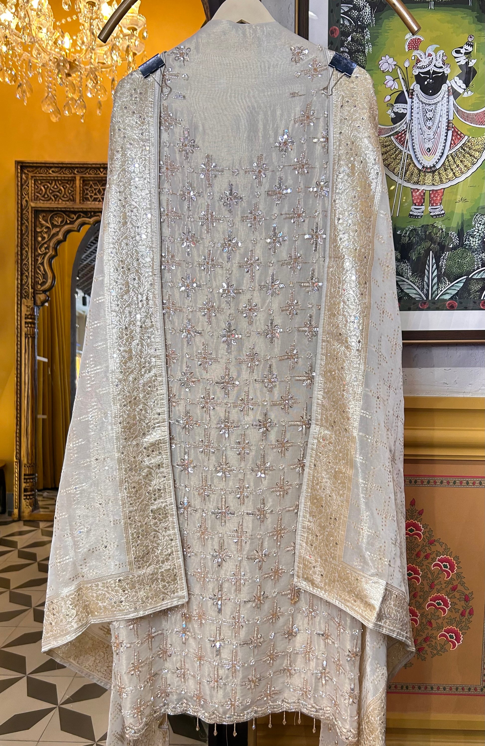 Intricately worked by hand, each stitch catches the light, creating a subtle shimmer across the fabric.