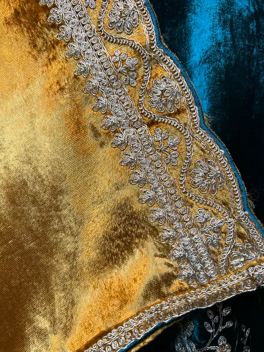 • Velvet Dupatta (2.25 mtrs) – Enhanced with elegant dori work and a four-side cut-work border.