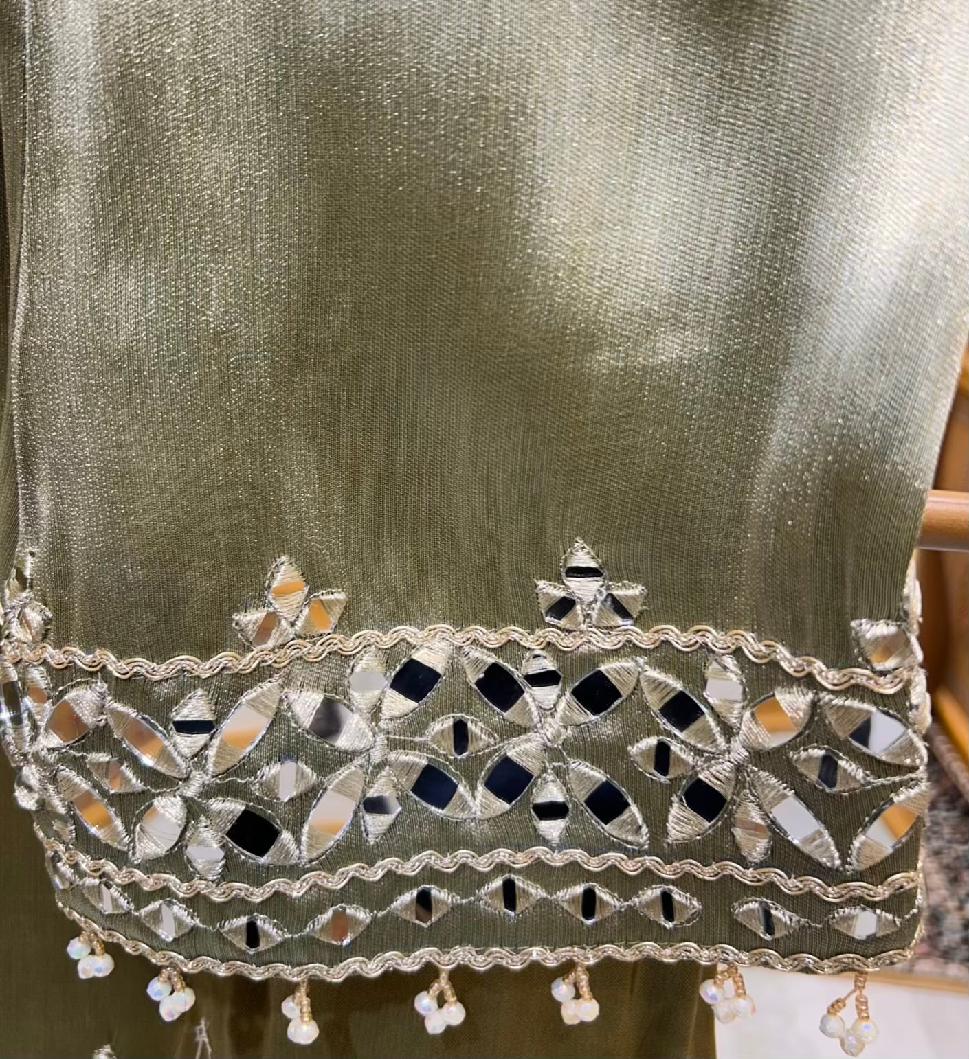 • Shimmer Organza Stitched Suit (Size 42) – Accentuated with intricate real mirror work for a radiant, festive finish.