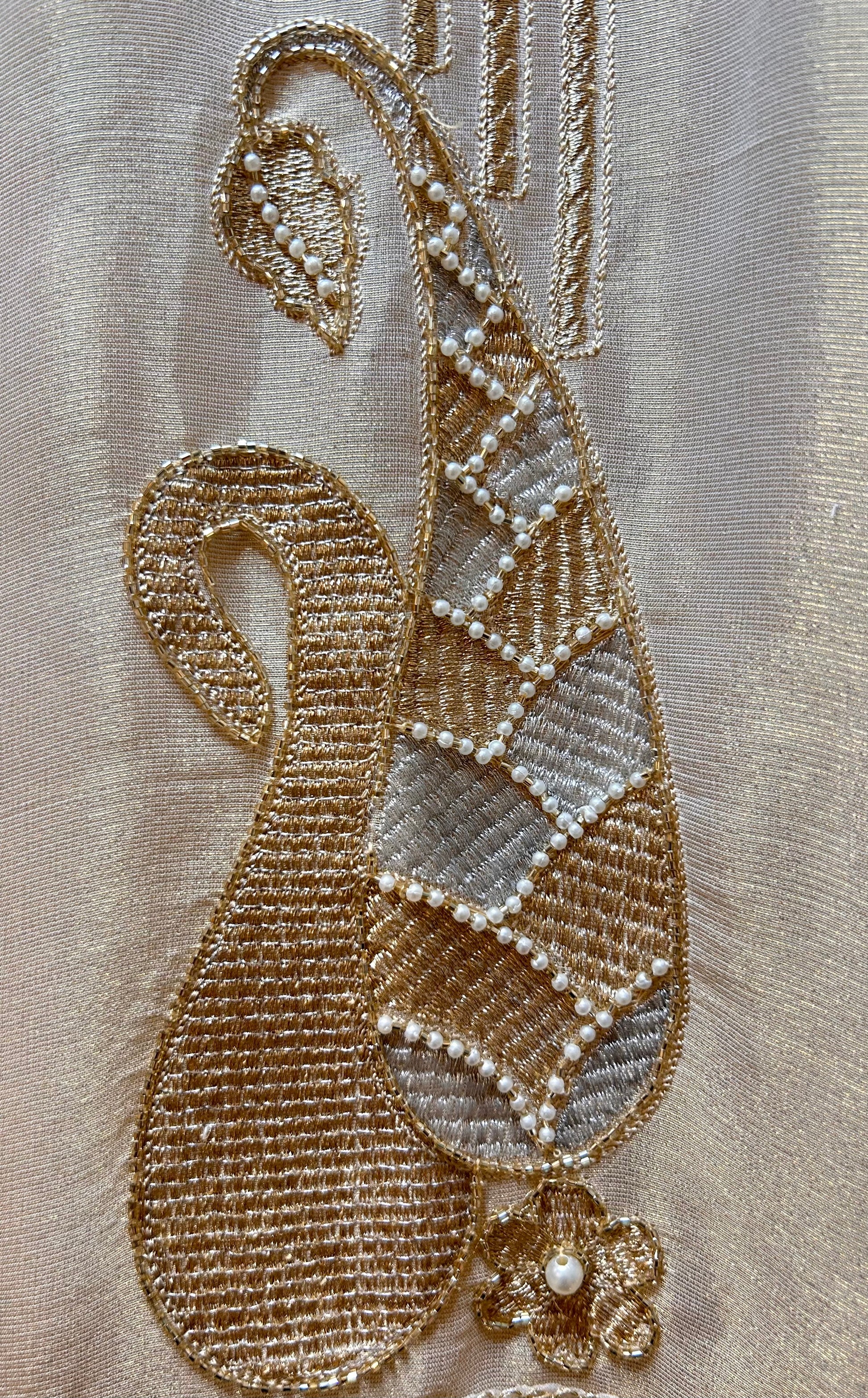 - Shimmer organza shirt with moti, kadana & hand embroidery on the neckline (2.5 mtr)