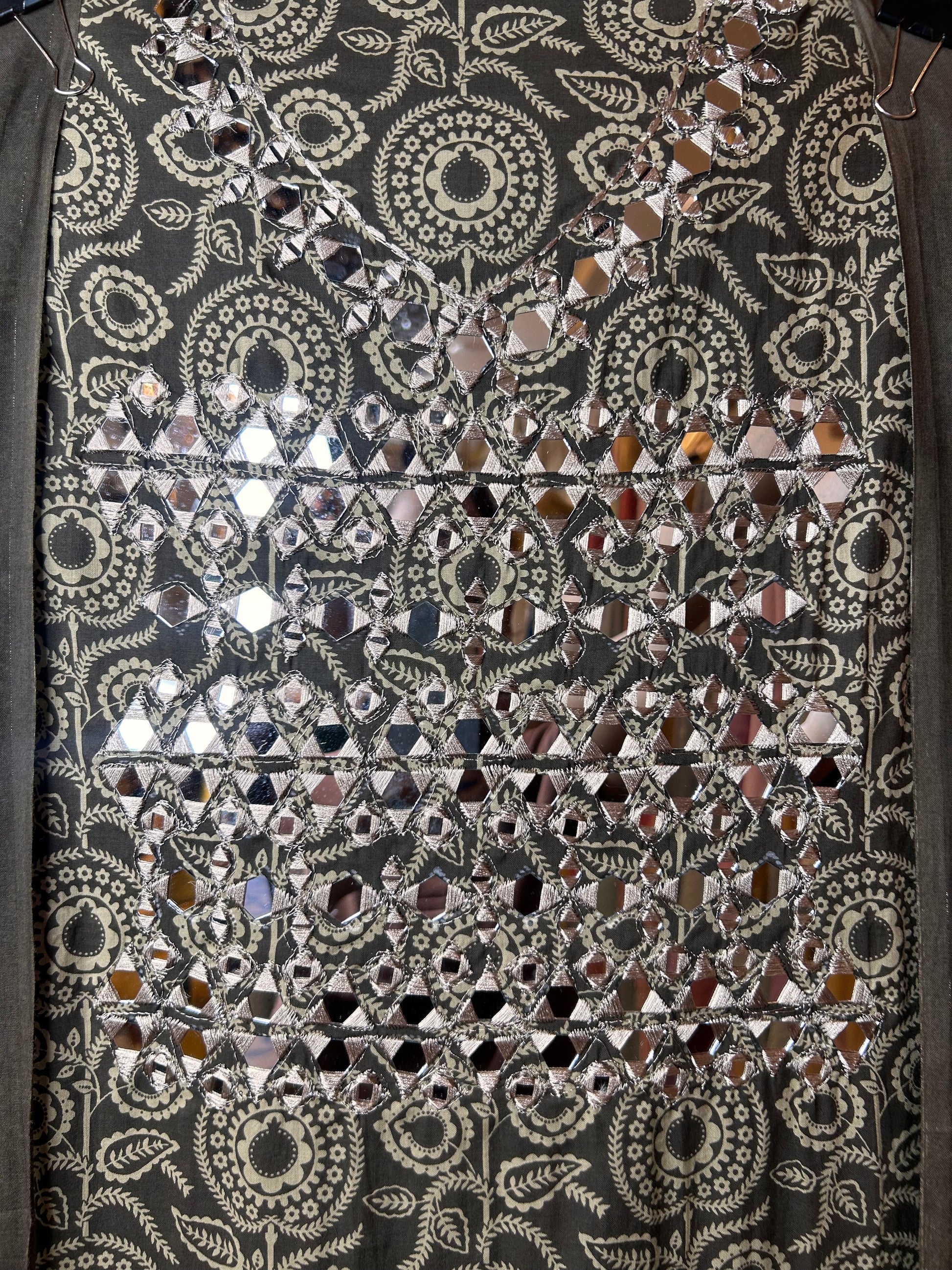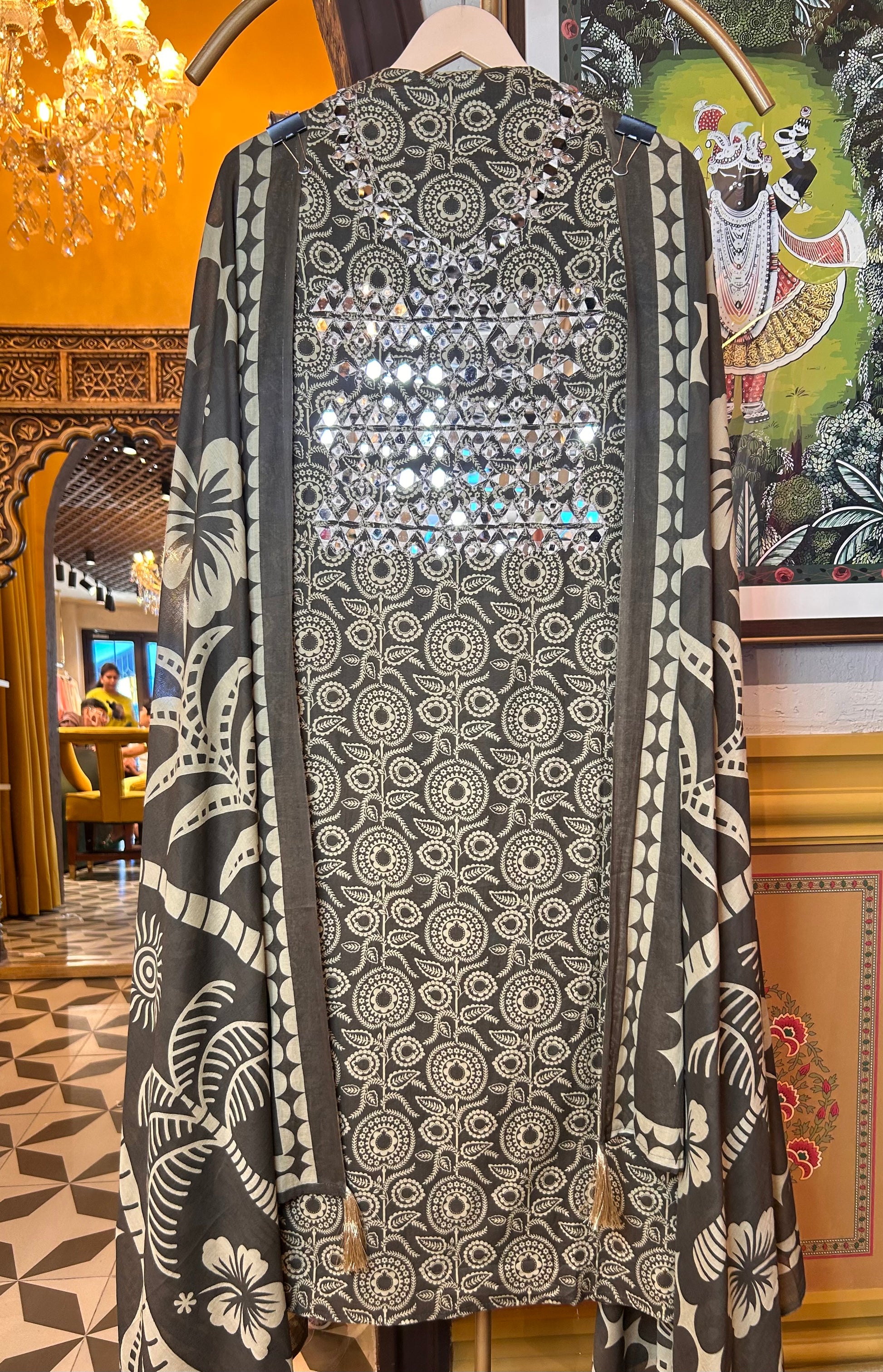 A soft, breathable cotton base featuring vibrant digital prints and a beautifully highlighted neckline with real mirror work — adding a subtle festive charm. -