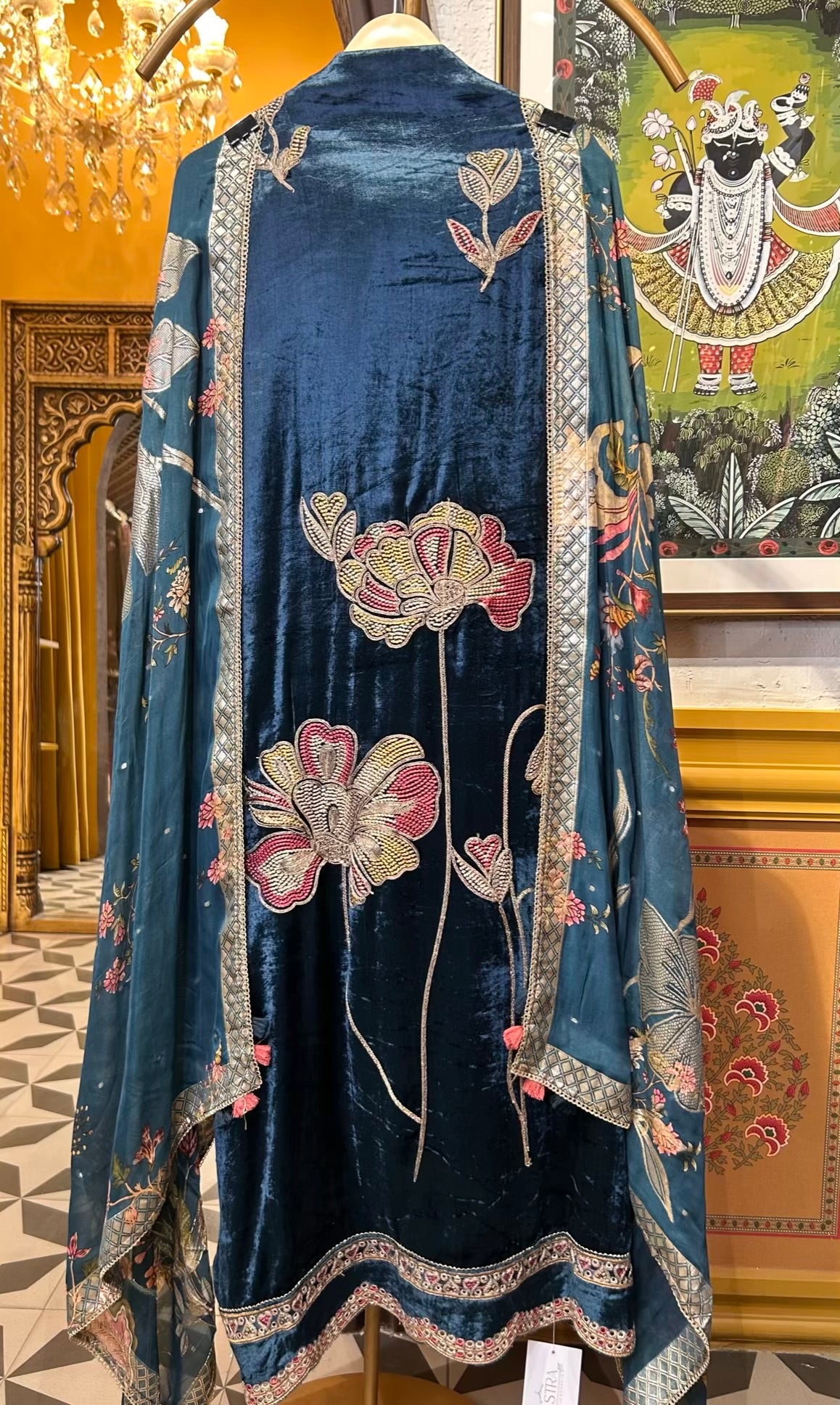 • Velvet Shirt (2.5 mtrs) – Embroidered with elegant thread and shimmer dori work for a radiant finish.
