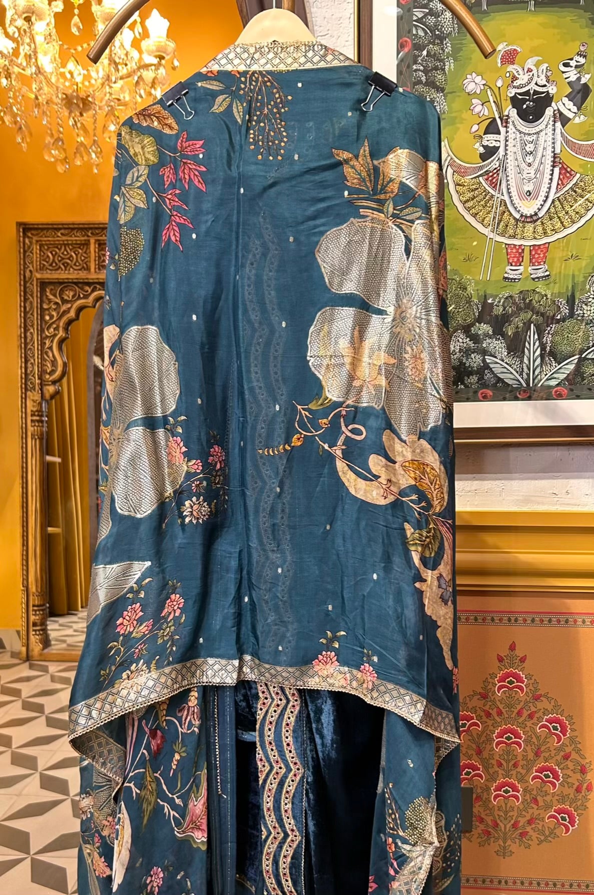 Paired with a digital printed Banarasi dupatta, featuring traditional weaves blended with contemporary prints, and a velvet bottom that adds richness and structure, this ensemble is the epitome of sophistication for the festive season.