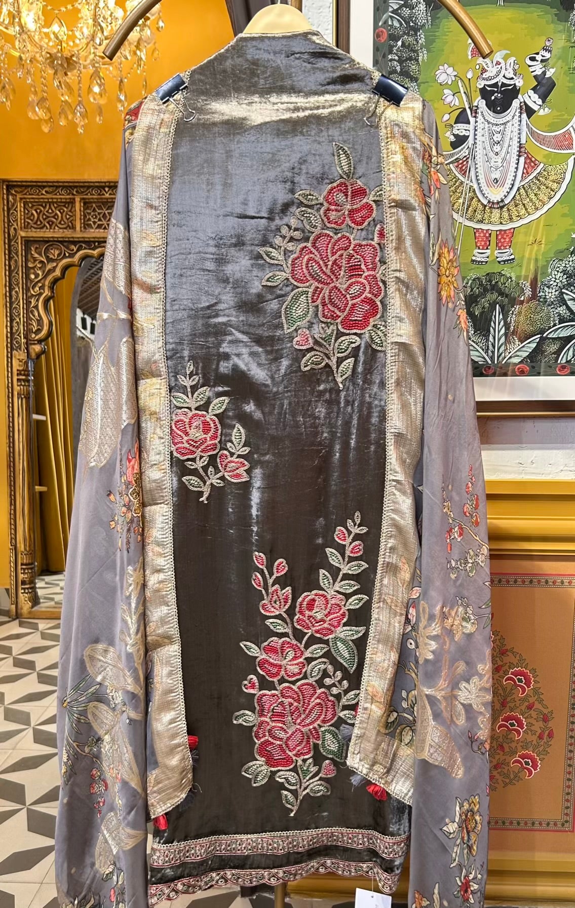 • Velvet Shirt (2.5 mtrs) – Embroidered with elegant thread and shimmer dori work for a radiant finish.
