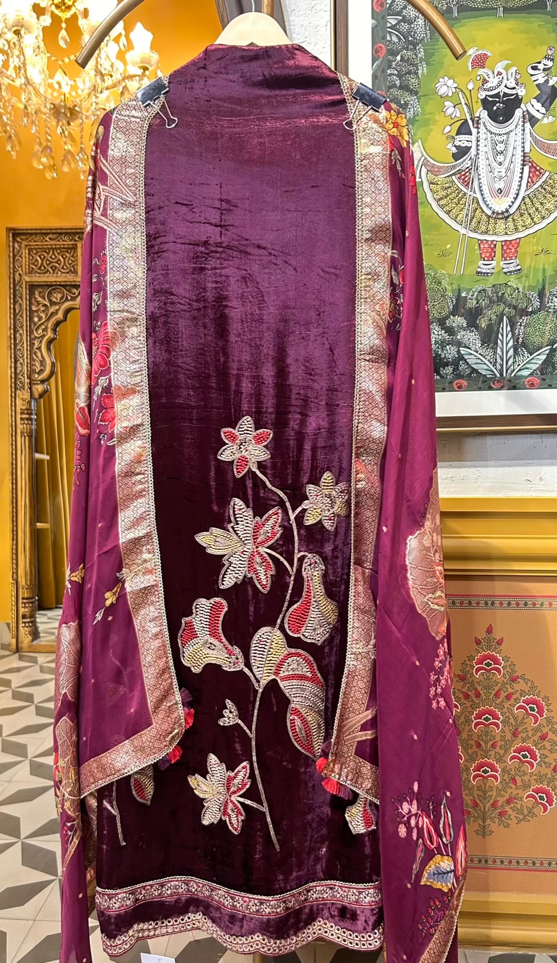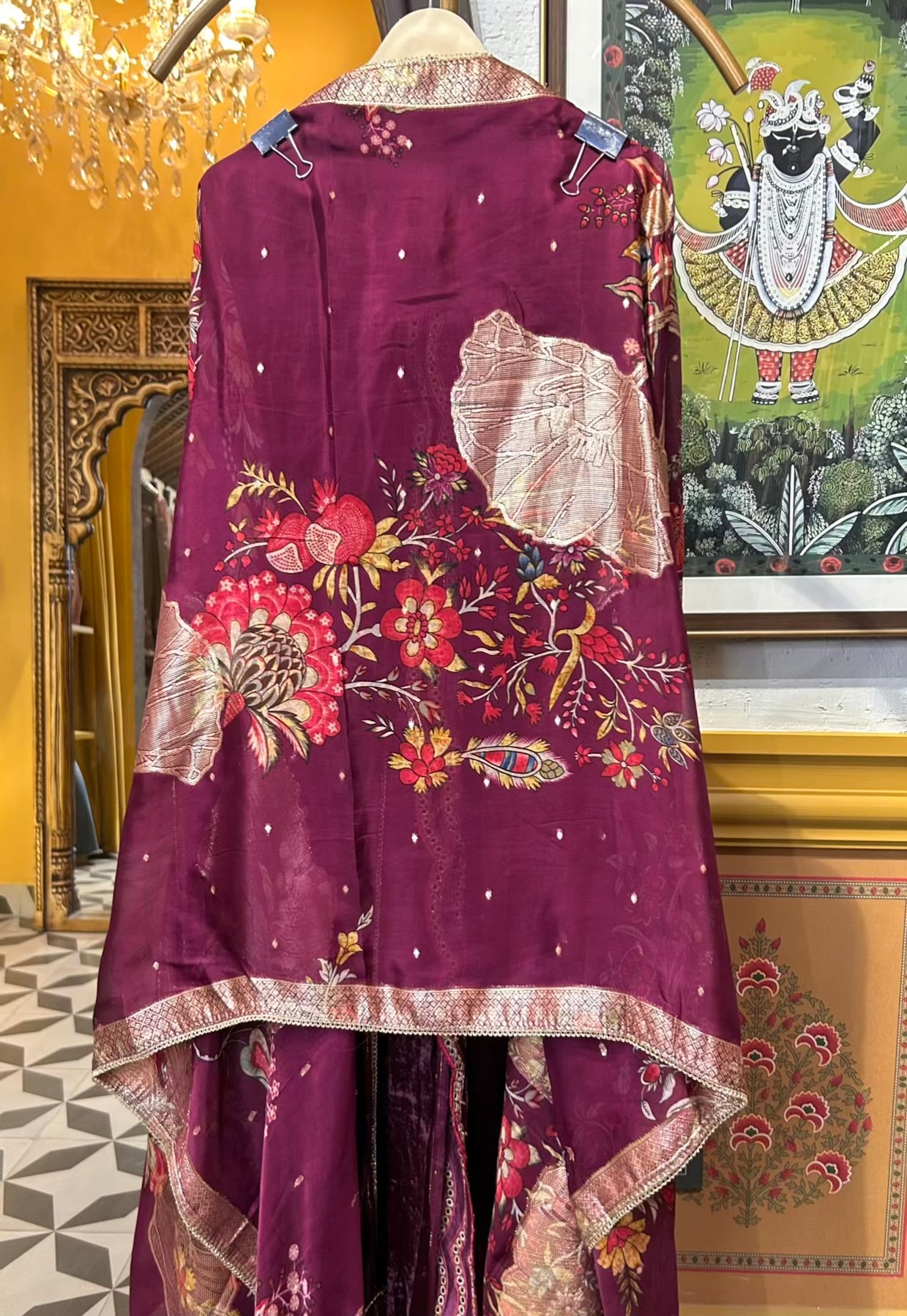 Paired with a digital printed Banarasi dupatta, featuring traditional weaves blended with contemporary prints, and a velvet bottom that adds richness and structure, this ensemble is the epitome of sophistication for the festive season.