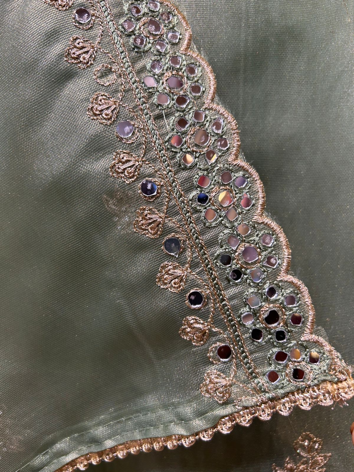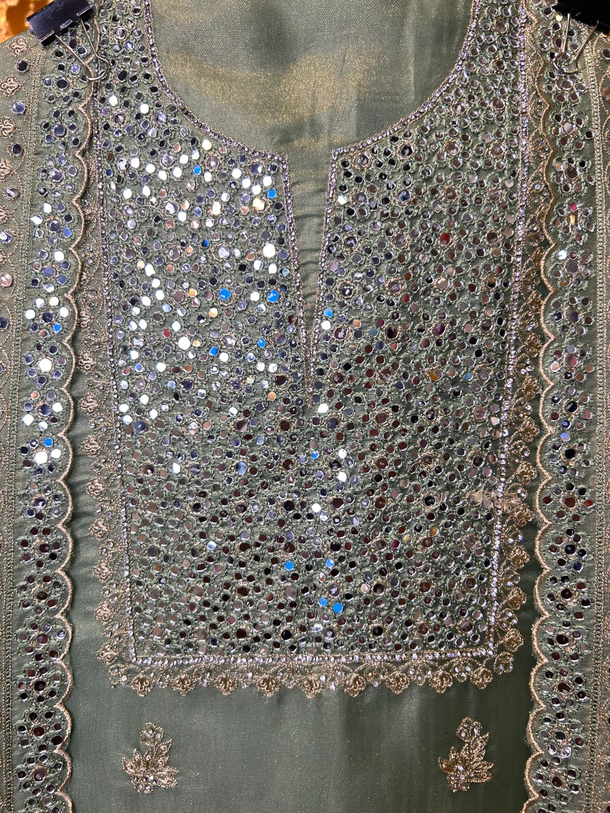 • Organza Shirt (2.5 mtrs) – Highlighted with elegant neckline mirror work for a subtle sparkle.