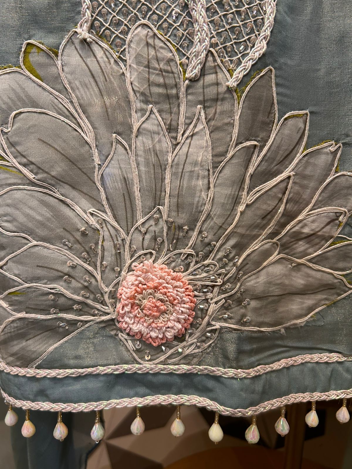 Ethereal and elegant — the Rimza Organza Suit embodies the allure of understated luxury. Crafted in luminous shimmer organza, the suit features exquisite hand embroidery that adds a touch of artisanal grace. Complemented by a matching shimmer organza dupatta and a smooth silk bottom, this ensemble radiates sophistication with every fold.