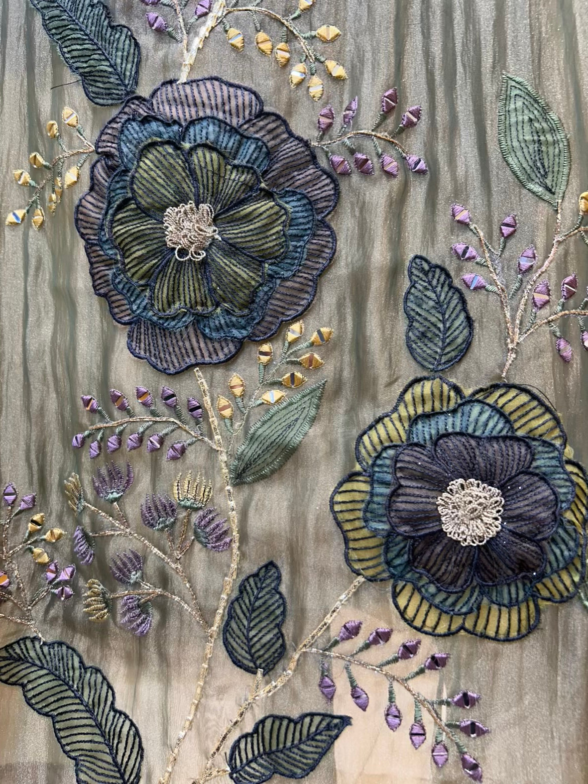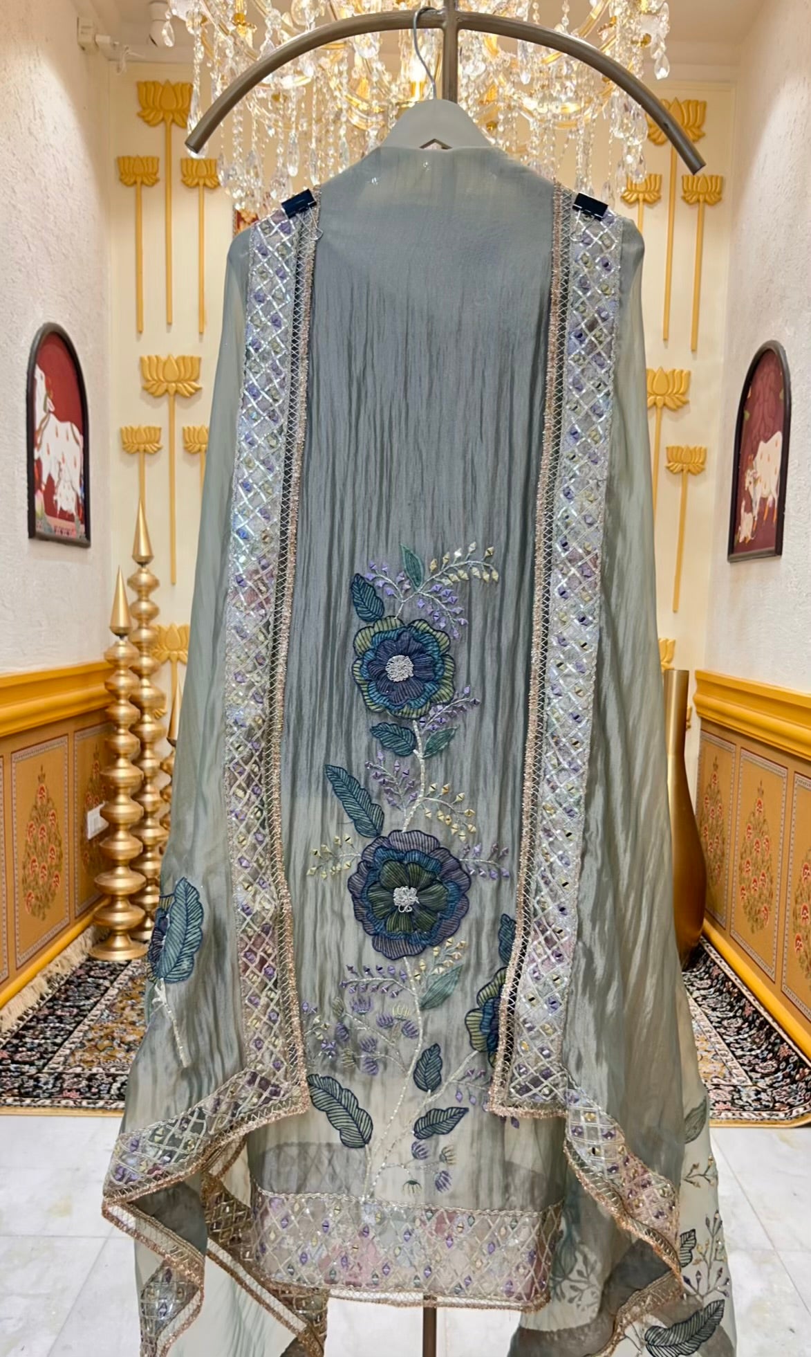 • Organza Suit (2.5 mtrs) – Hand-adorned with thread, dori, and real mirror work for a refined yet festive finish.