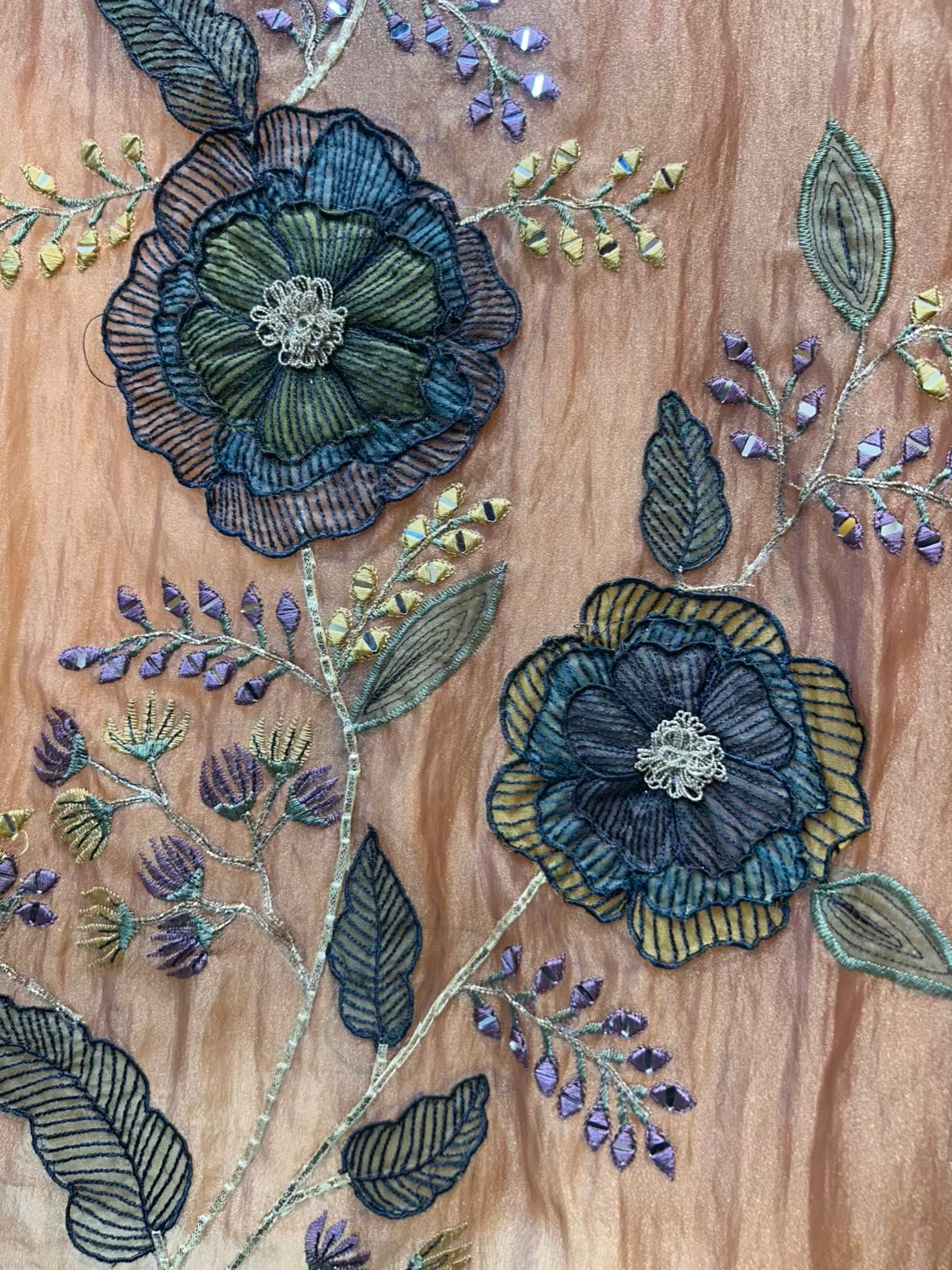 • Organza Suit (2.5 mtrs) – Hand-adorned with thread, dori, and real mirror work for a refined yet festive finish.