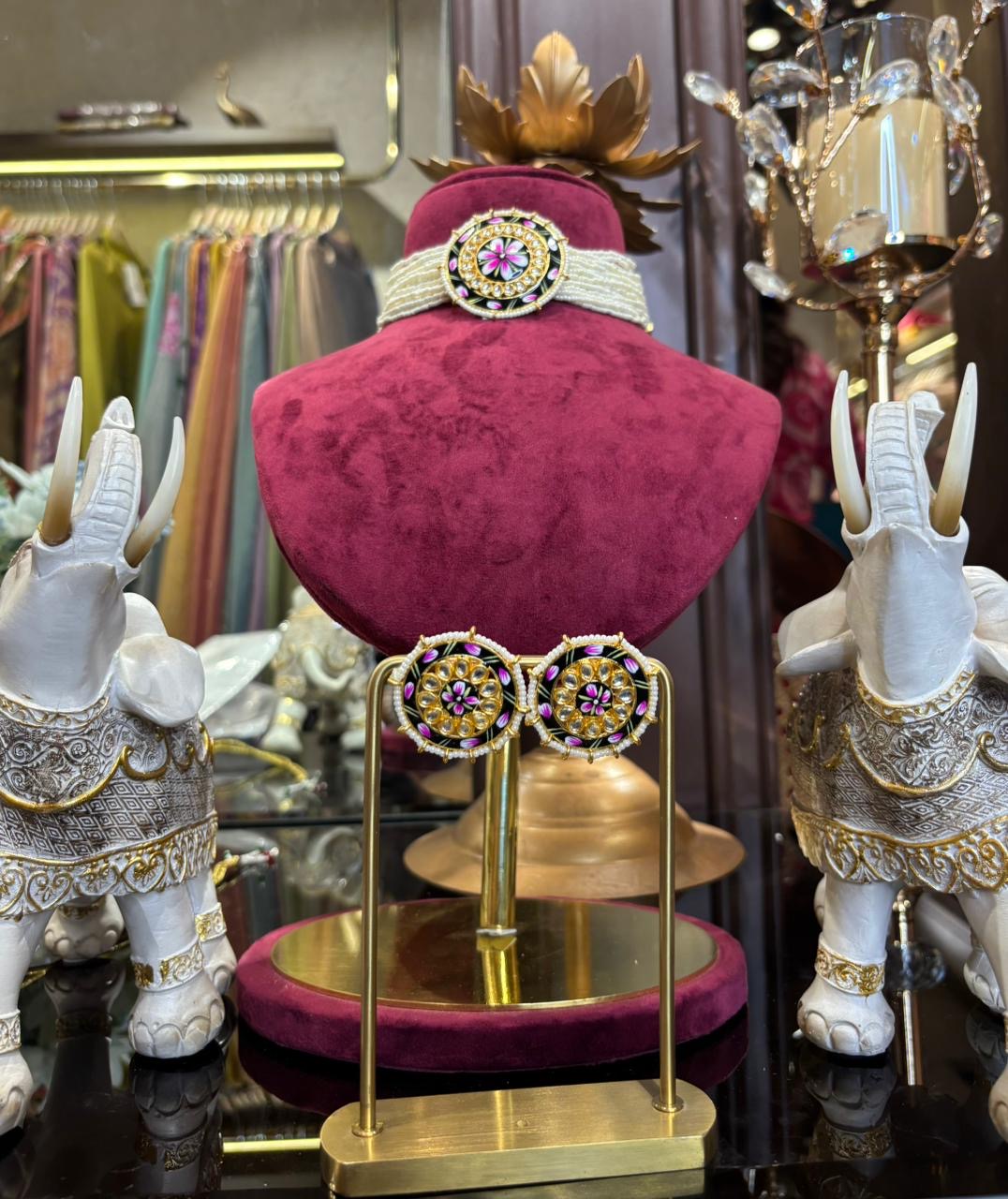 • Matching Earrings – Circular motifs that mirror the choker’s intricate design, adding harmony and elegance.