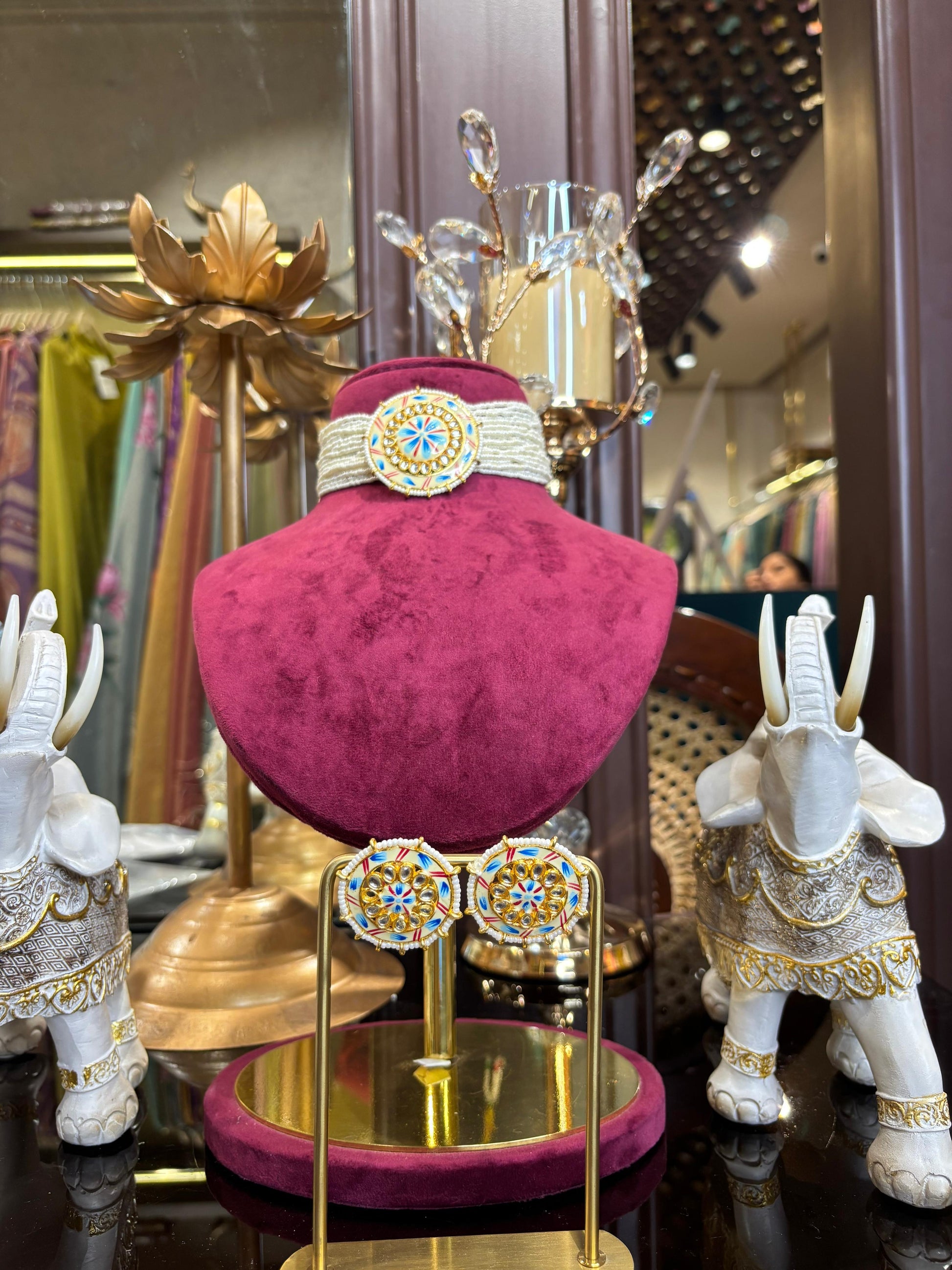 • Matching Earrings – Circular motifs that mirror the choker’s intricate design, adding harmony and elegance.