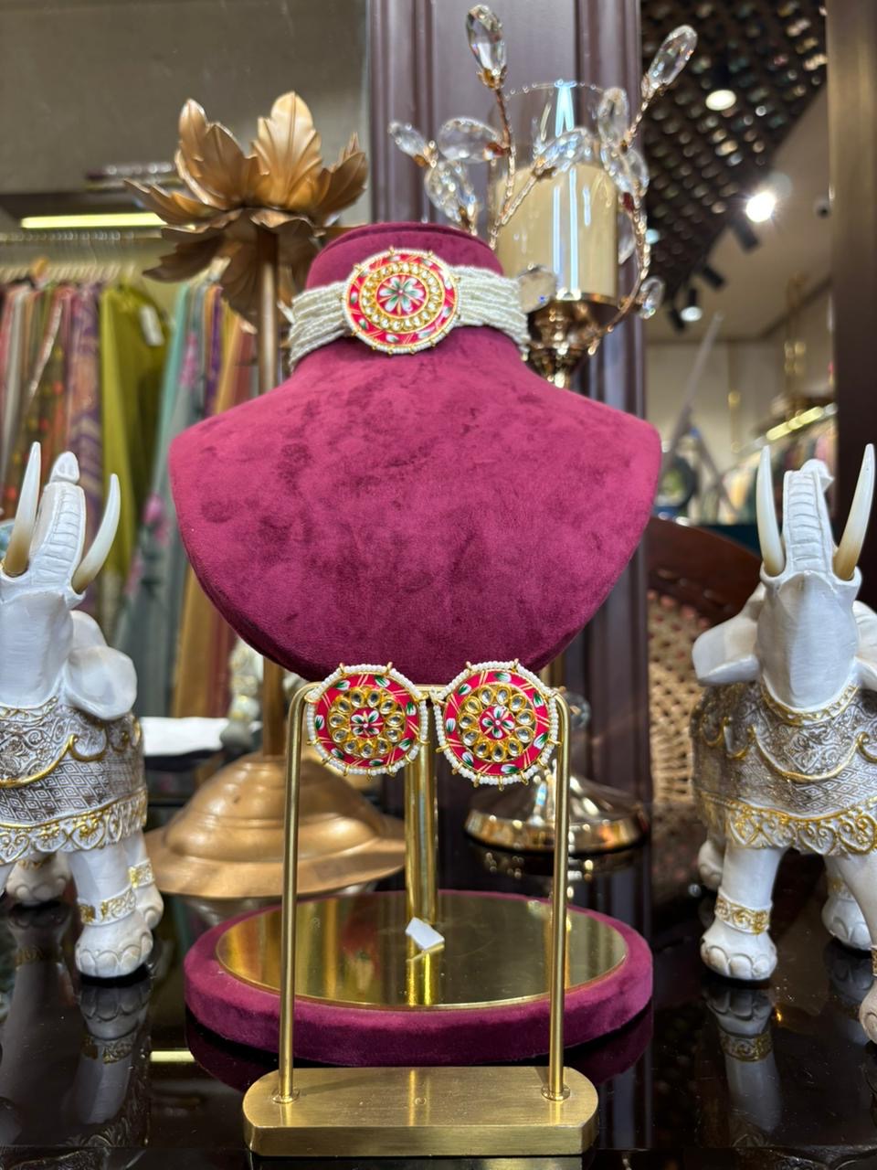 • Matching Earrings – Circular motifs that mirror the choker’s intricate design, adding harmony and elegance.