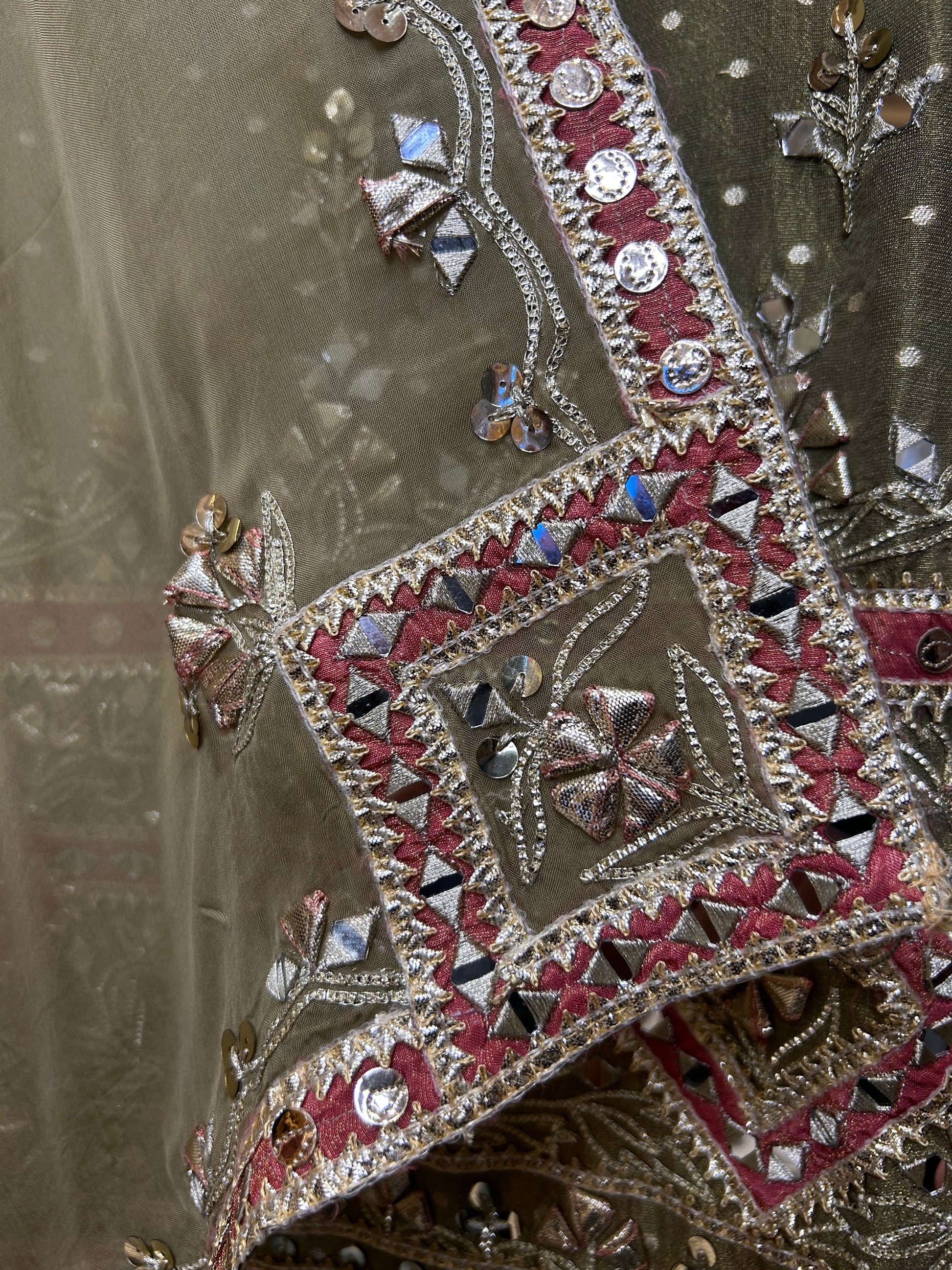 An exquisite organza base, delicately illuminated with real mirrors and gleaming gota, creating a radiant silhouette of festive charm.