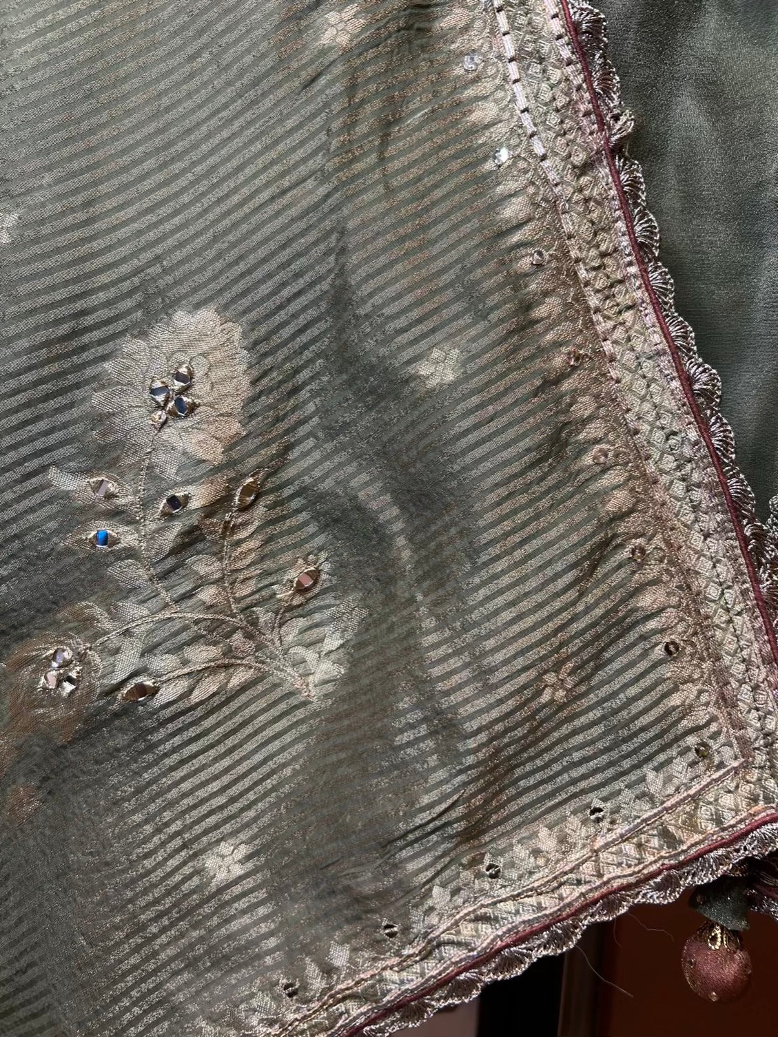 • Shimmer Organza Farsi Salwar Embellished with mirror, Dori, and sequin work, adding festive brilliance.