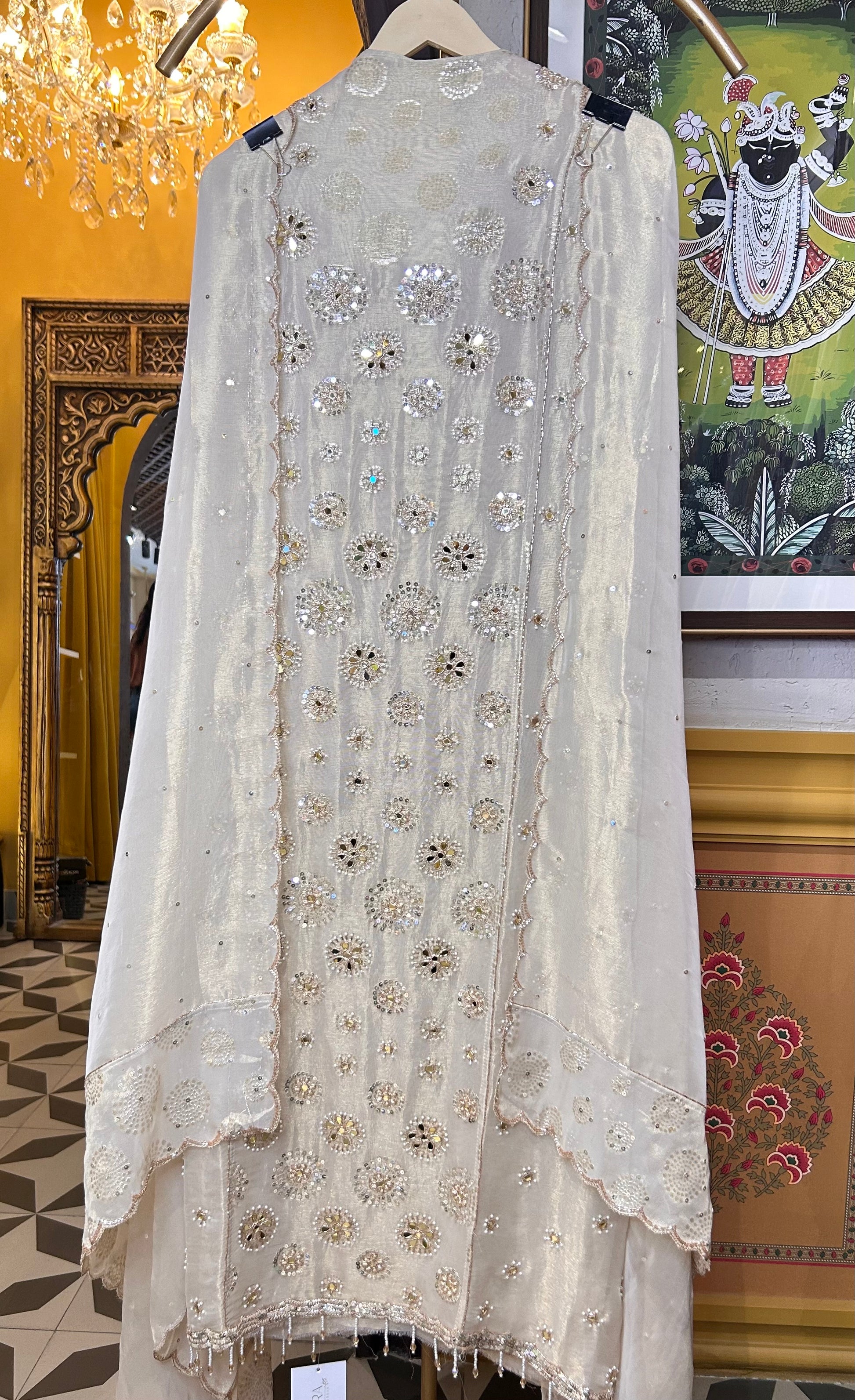 The Roshniya Set is an ode to timeless craftsmanship—shimmer organza adorned with all-over handwork that catches the light with every movement. The look is completed with a soft silk base and a delicately sheer dupatta, offering effortless elegance.