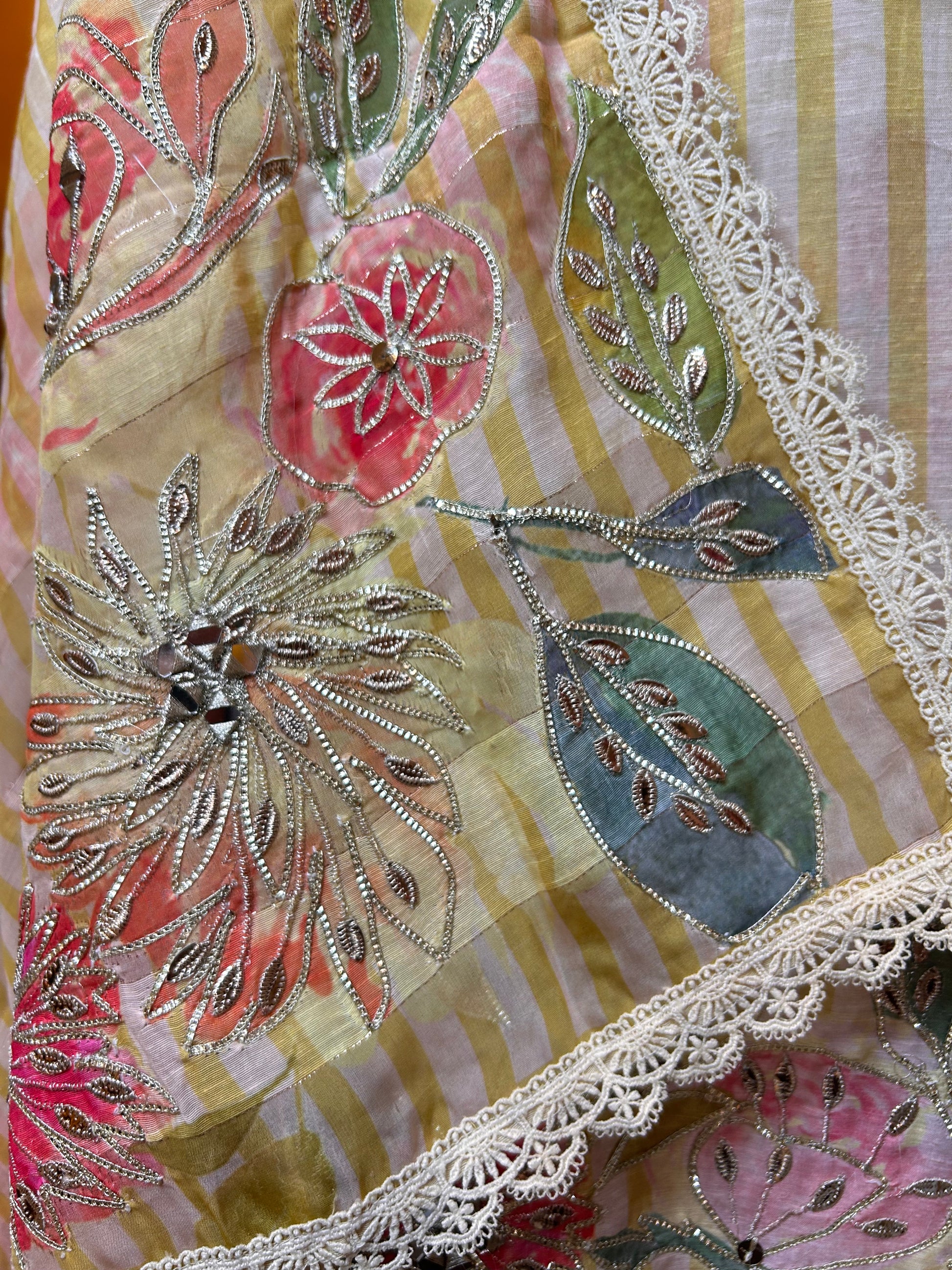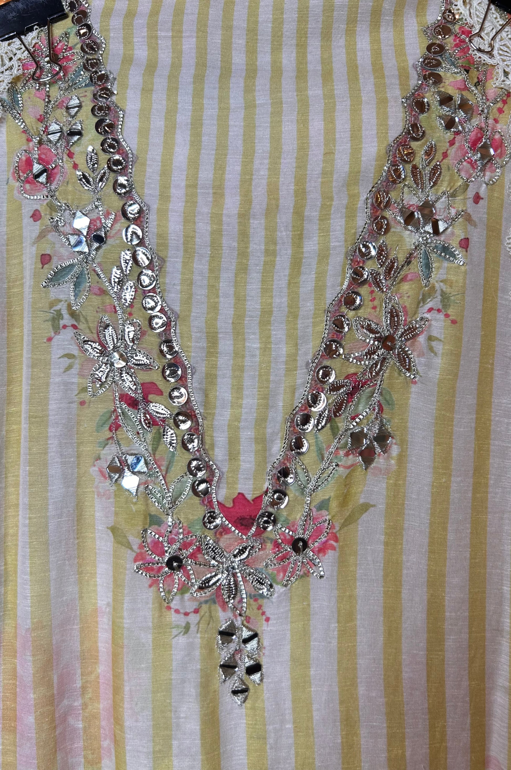 A digitally printed base brought to life with intricate Gota Patti, real mirror detailing, and neckline embroidery — a graceful nod to traditional craftsmanship.