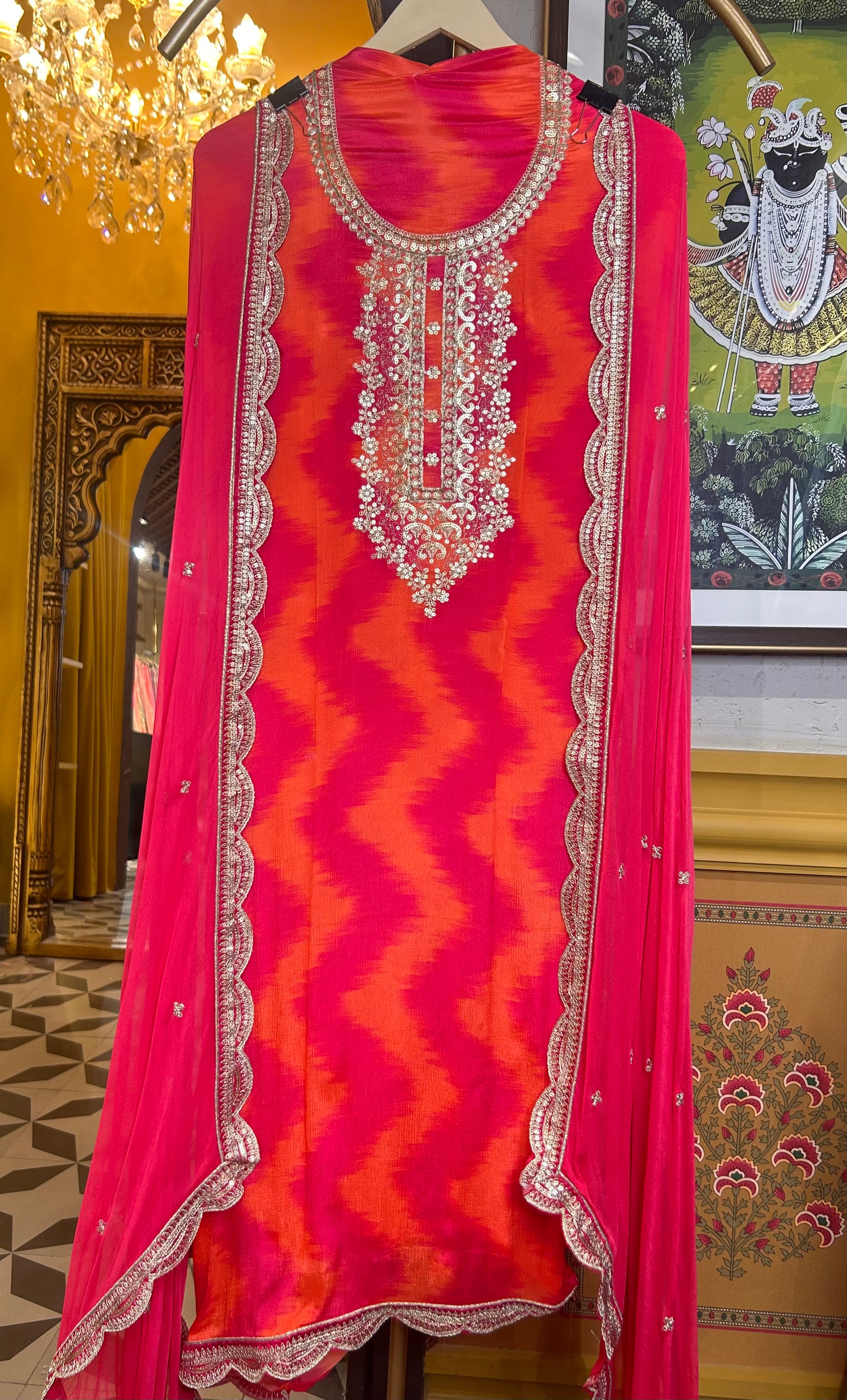 Lightweight and lustrous, the Chinon fabric is elevated with fine zari embroidery along the neckline.