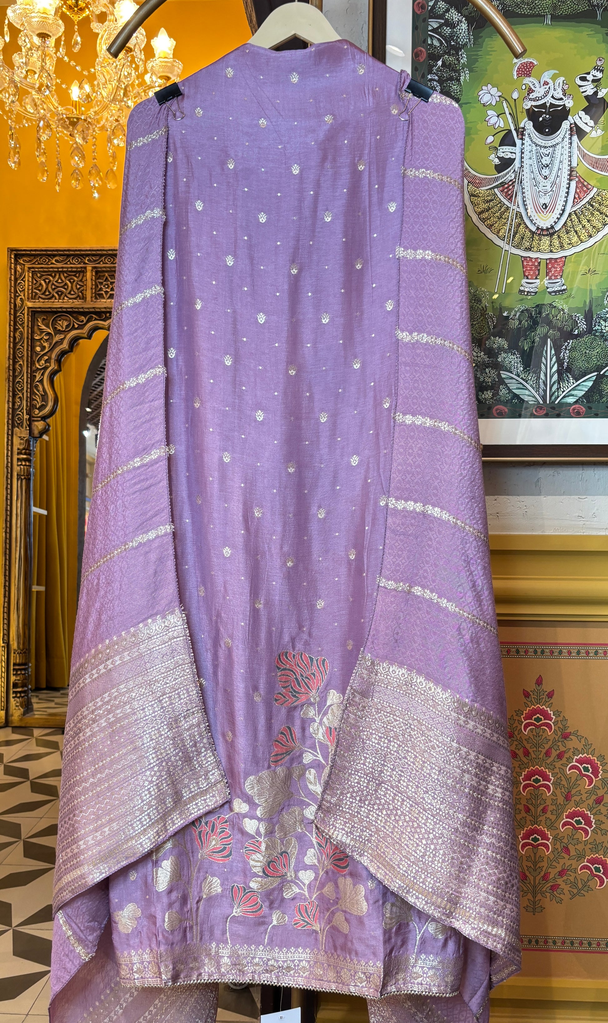 A silhouette rooted in tradition, elevated with subtle shimmer — the Ruhaniyat Banarasi Suit is your timeless ode to festive finesse.