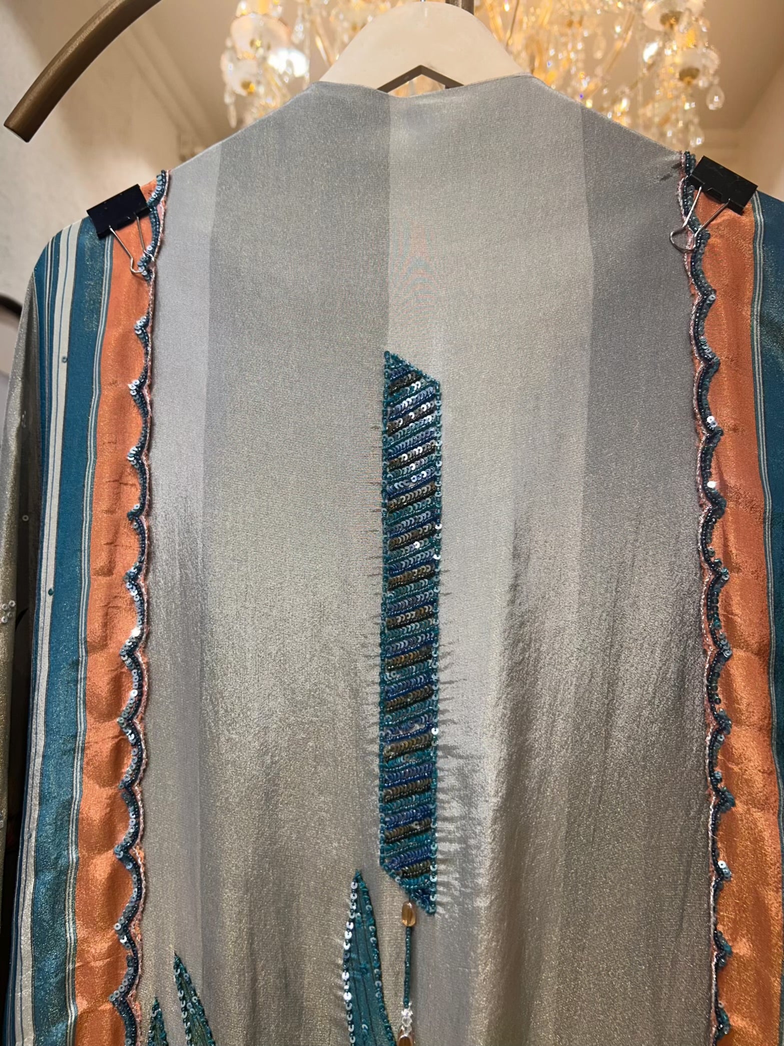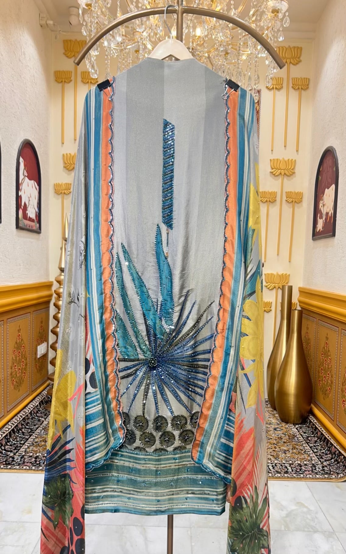 - Shimmer Organza Suit (2.5 mtrs) – Digitally printed with floral motifs, accented with sequins and moti handwork for a soft, luminous finish.