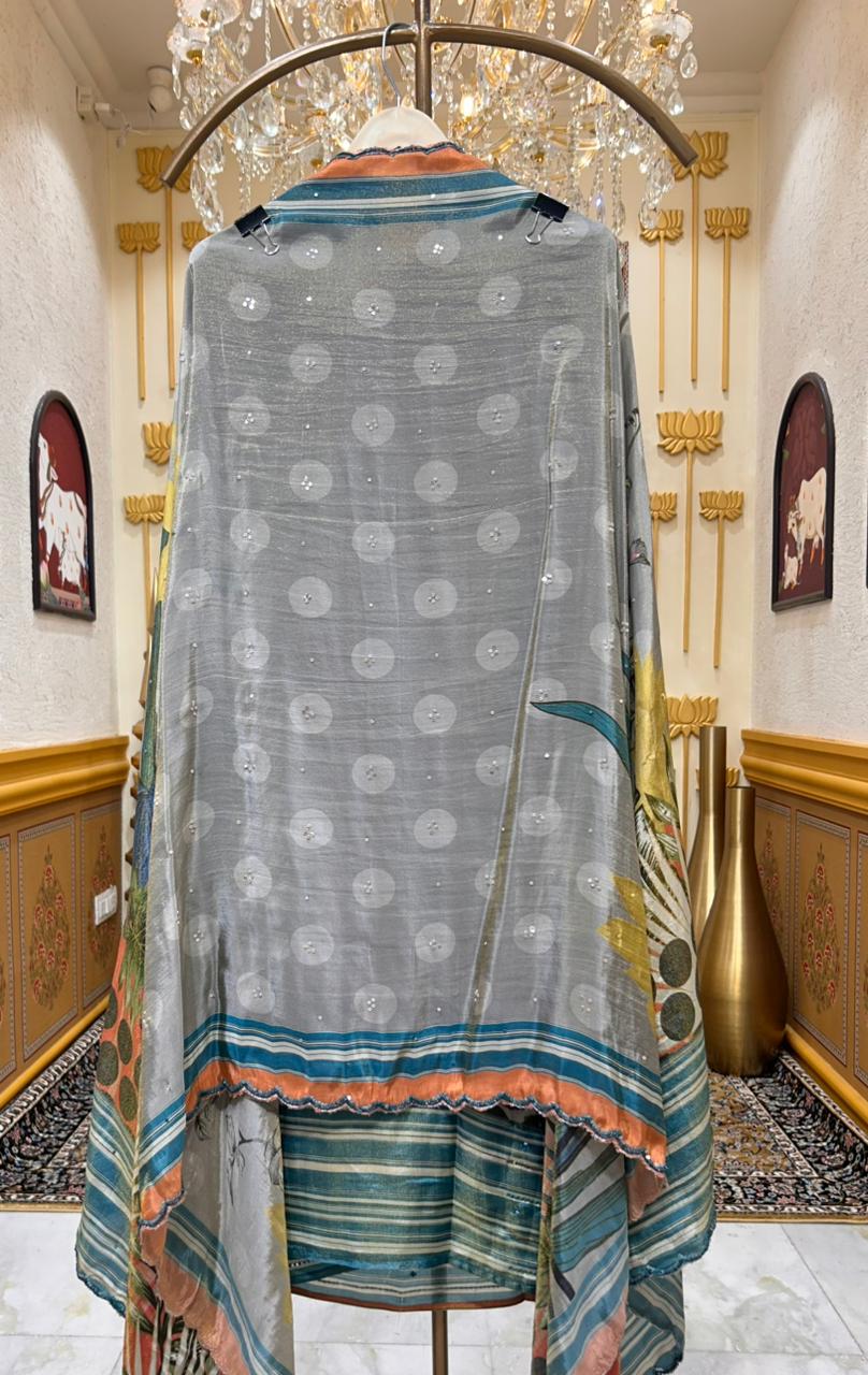 Soft florals meet subtle shimmer in the Ruhgraa Grey Bloom Suit, a refined ensemble crafted for effortless elegance. The shimmer organza suit features delicate digital floral prints, elevated with fine sequins and moti handwork that add a gentle sparkle without overpowering the look. Paired with a matching digitally printed organza dupatta and a smooth silk bottom, this suit captures modern grace with timeless charm.