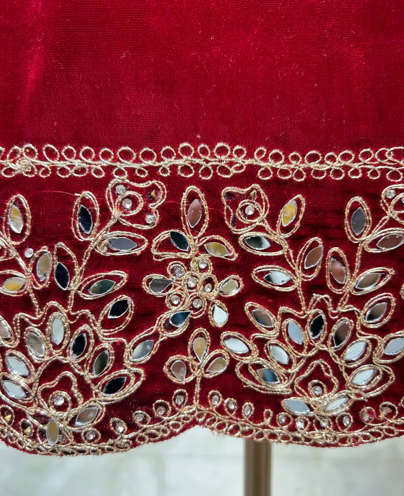 • Velvet Dupatta (2.25 mtrs) – Finished with four-side cutwork borders enriched with zari and mirror work.