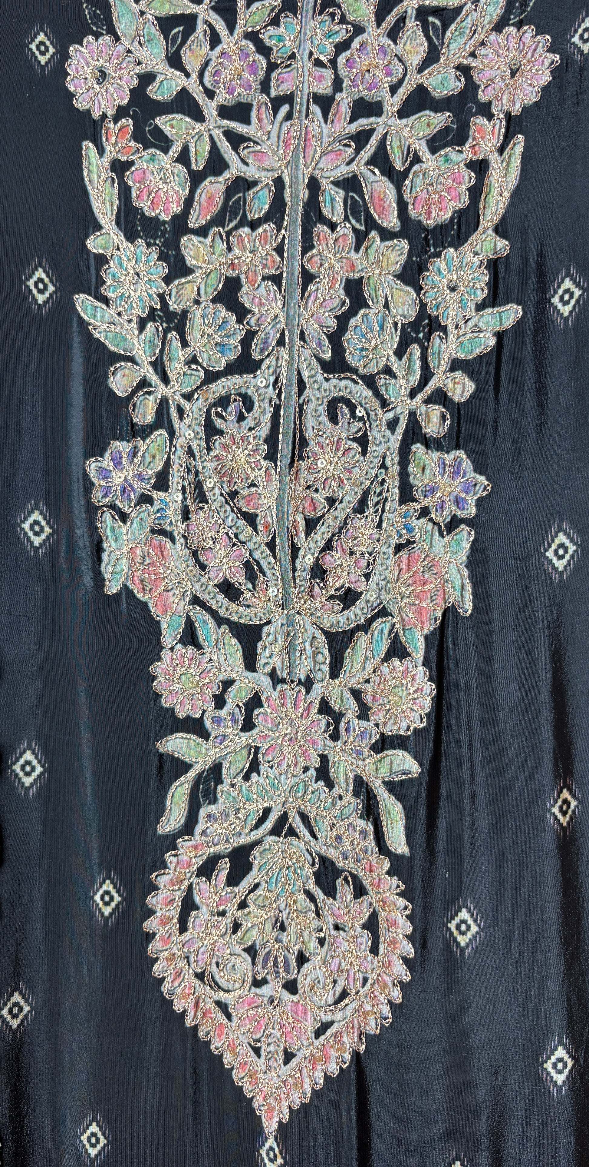 A fluid crepe canvas brought to life with elegant digital prints and delicate zari highlights — offering a graceful shimmer with every step.