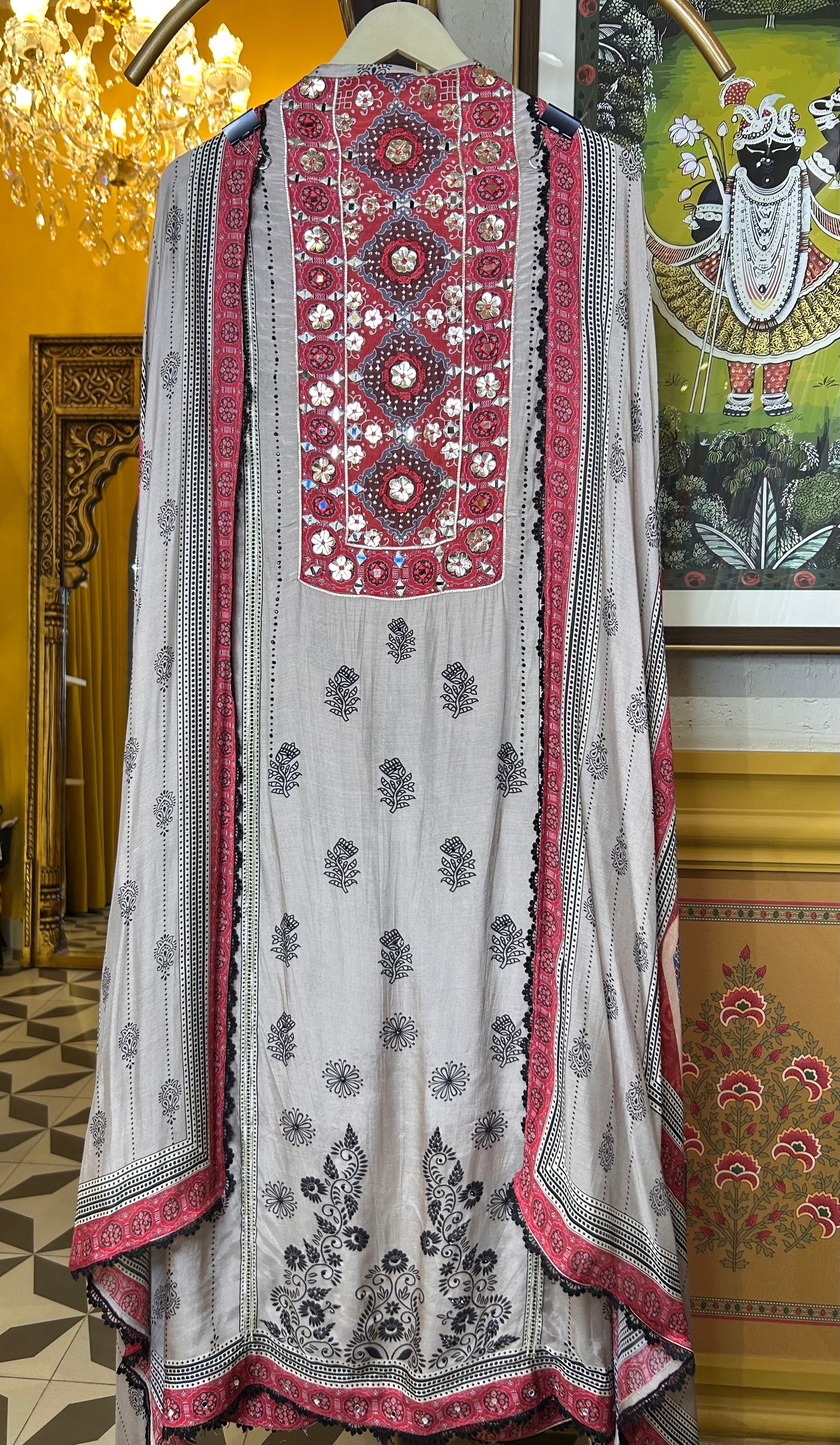 A soft, breathable fabric adorned with glistening mirror work and delicate gota detailing at the neckline — a quiet nod to tradition with a modern twist. -