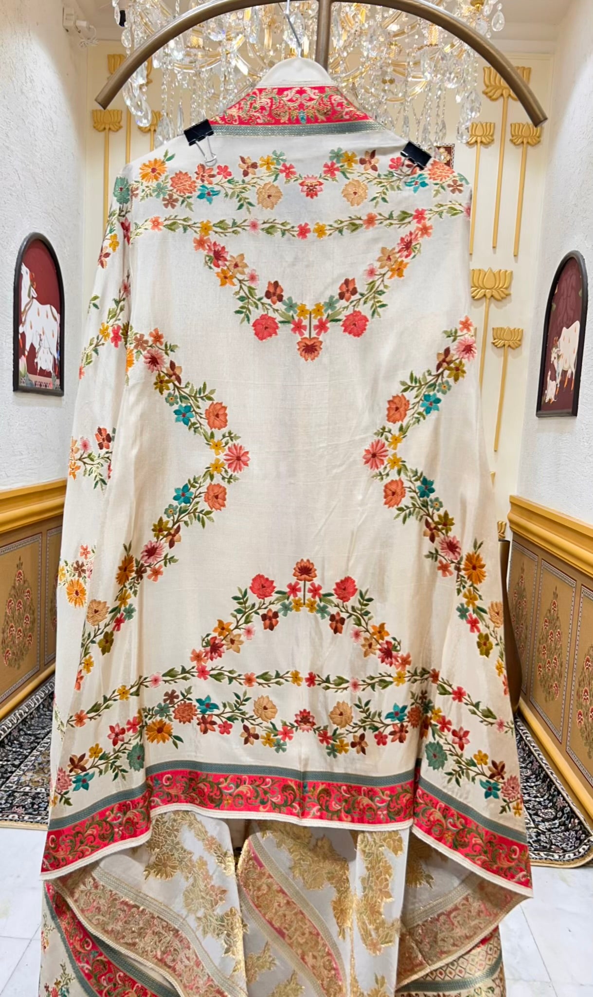 Paired with a beautifully coordinated Banarasi silk dupatta that flows effortlessly, and a comfortable cotton shantoon bottom for ease of wear, this set strikes the perfect balance between tradition and refinement—ideal for women who appreciate authentic handwoven elegance.