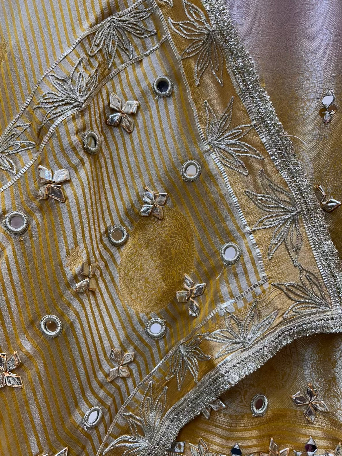 A celebration of traditional charm and festive radiance — the Sarnoor Gota Mirror Suit brings together timeless craftsmanship and luminous detailing. The shimmer organza Banarasi suit is adorned with real mirror and gotta work, creating a beautifully reflective, regal look. Paired with a matching Banarasi dupatta featuring mirror-gotta lace on all four sides and a soft silk bottom, this set exudes classic elegance with a festive glow.