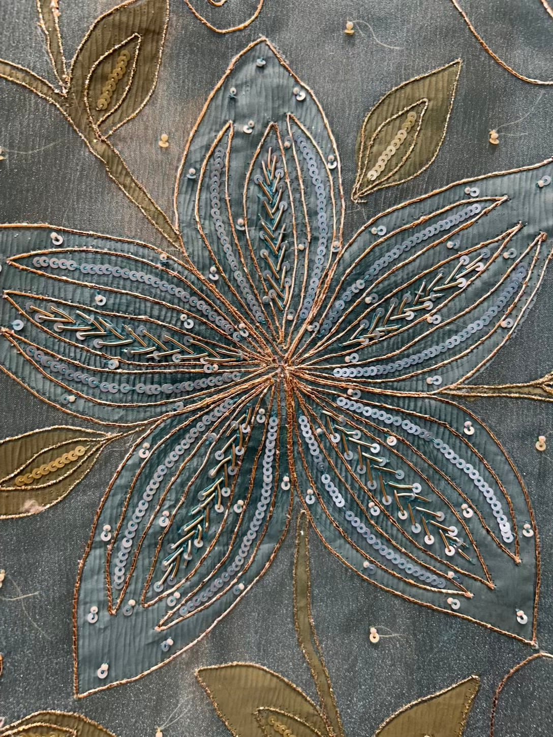 • Shimmer Organza Suit (2.5 mtrs) – Handprinted and adorned with moti, sequins, mirror and cut-dana work for a radiant finish.