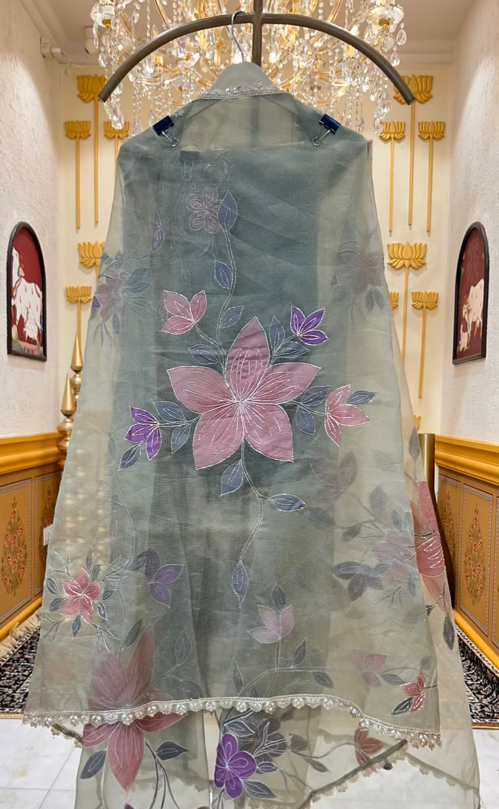• Shimmer Organza Suit (2.5 mtrs) – Handprinted and adorned with moti, sequins, mirror and cut-dana work for a radiant finish.