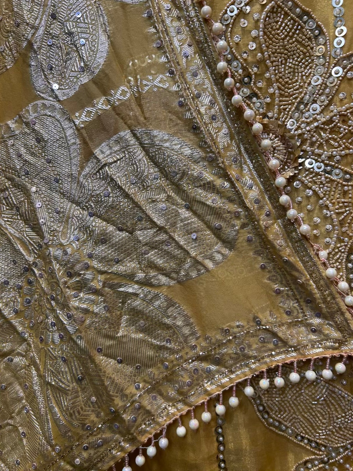 Radiant and regal, the Sehrish-é-Noor Suit captures the timeless elegance of shimmer and craftsmanship. The shimmer organza shirt, adorned with intricate handwork, exudes a soft, luminous glow — a perfect blend of grace and grandeur.