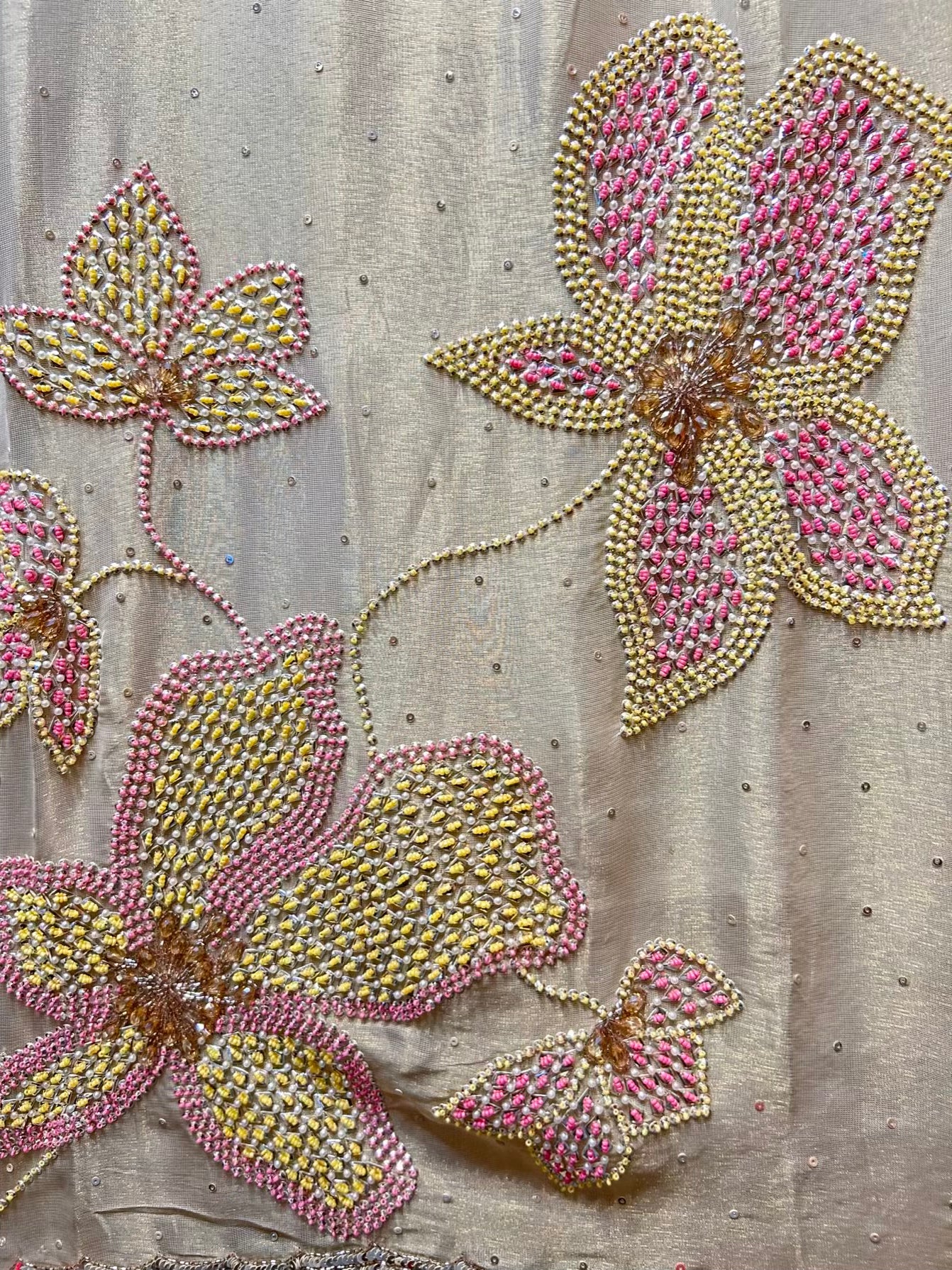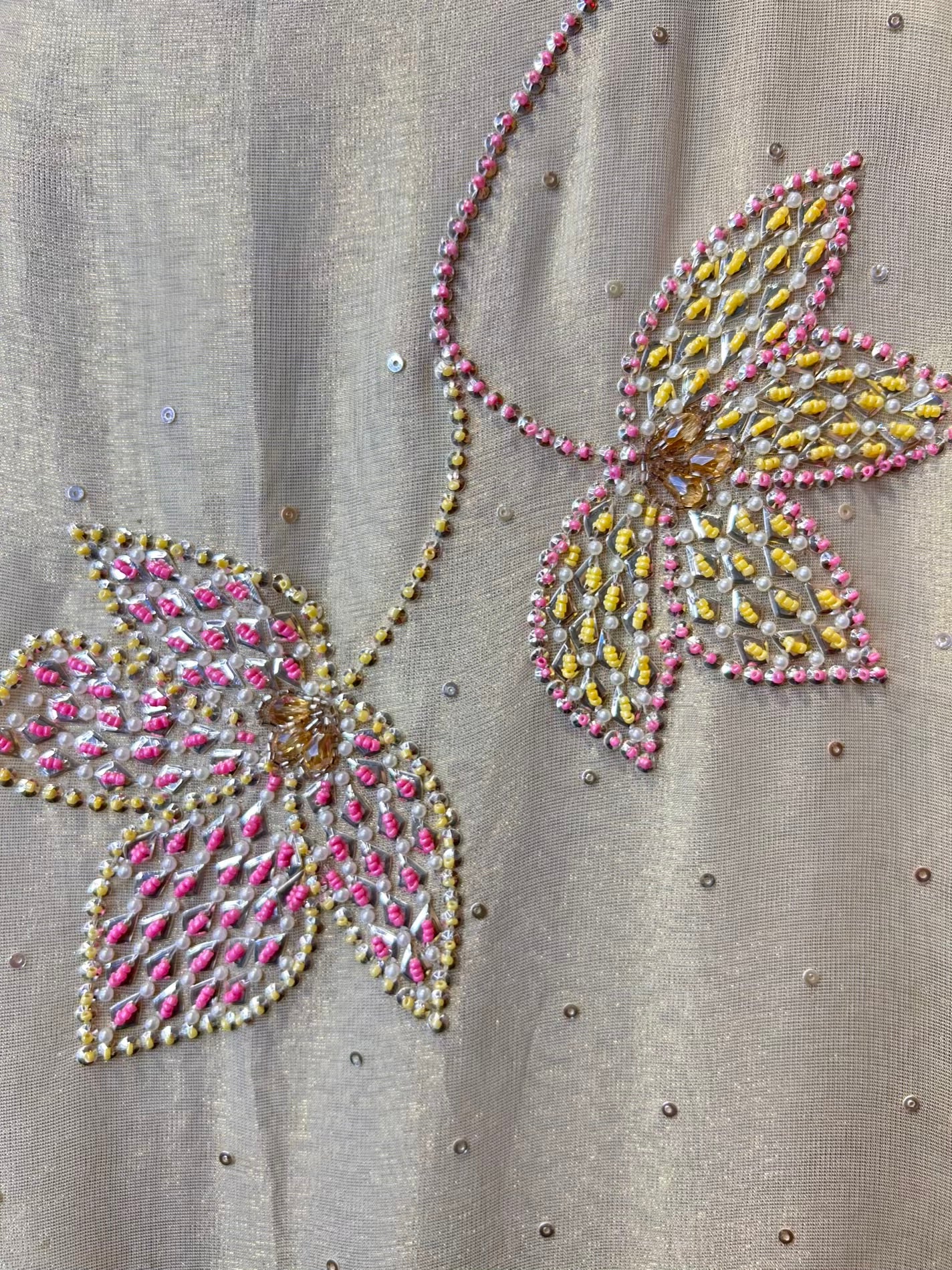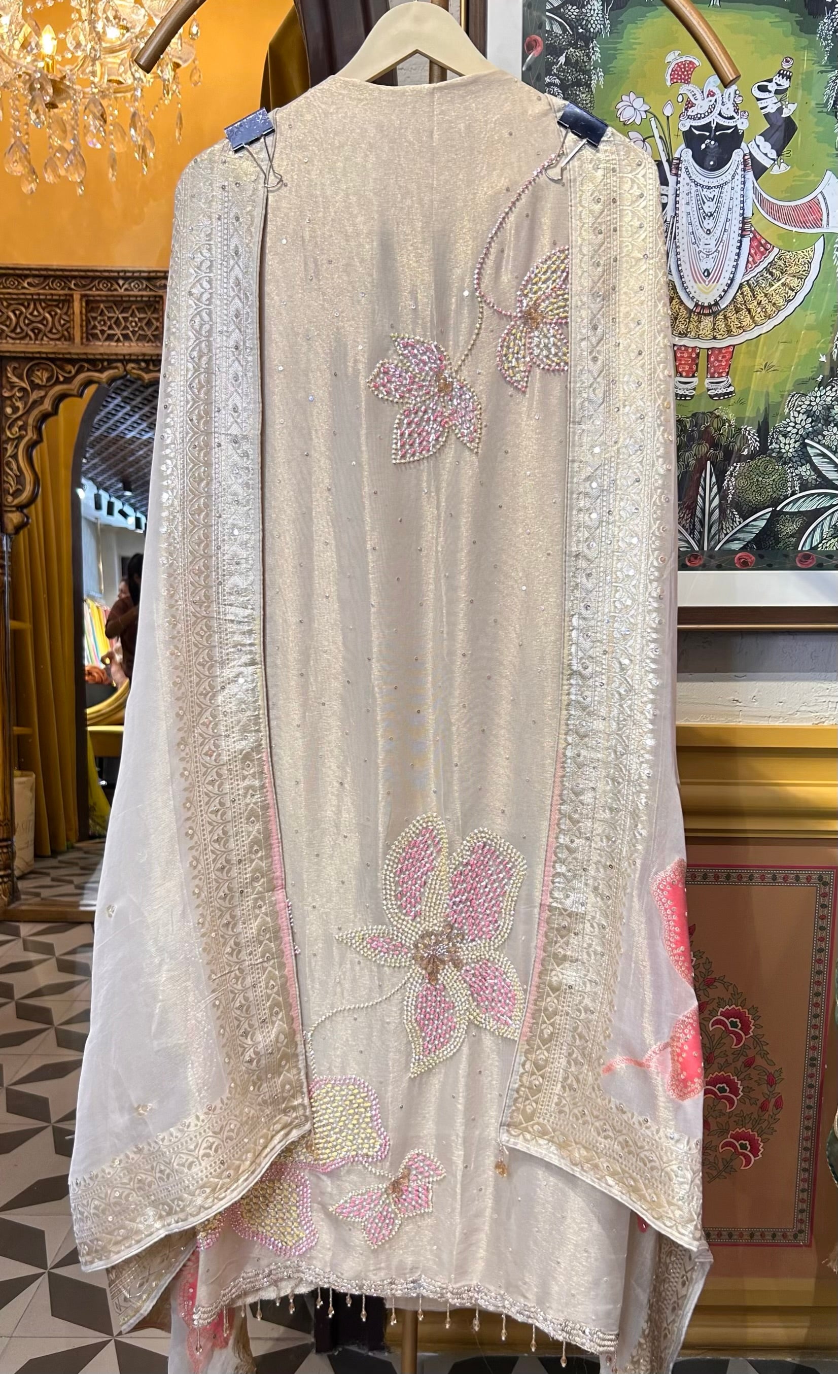 • Shimmer Organza Suit (2.5 mtrs) – Embellished with moti, cut dana, sequins, and pulse work for a radiant finish.