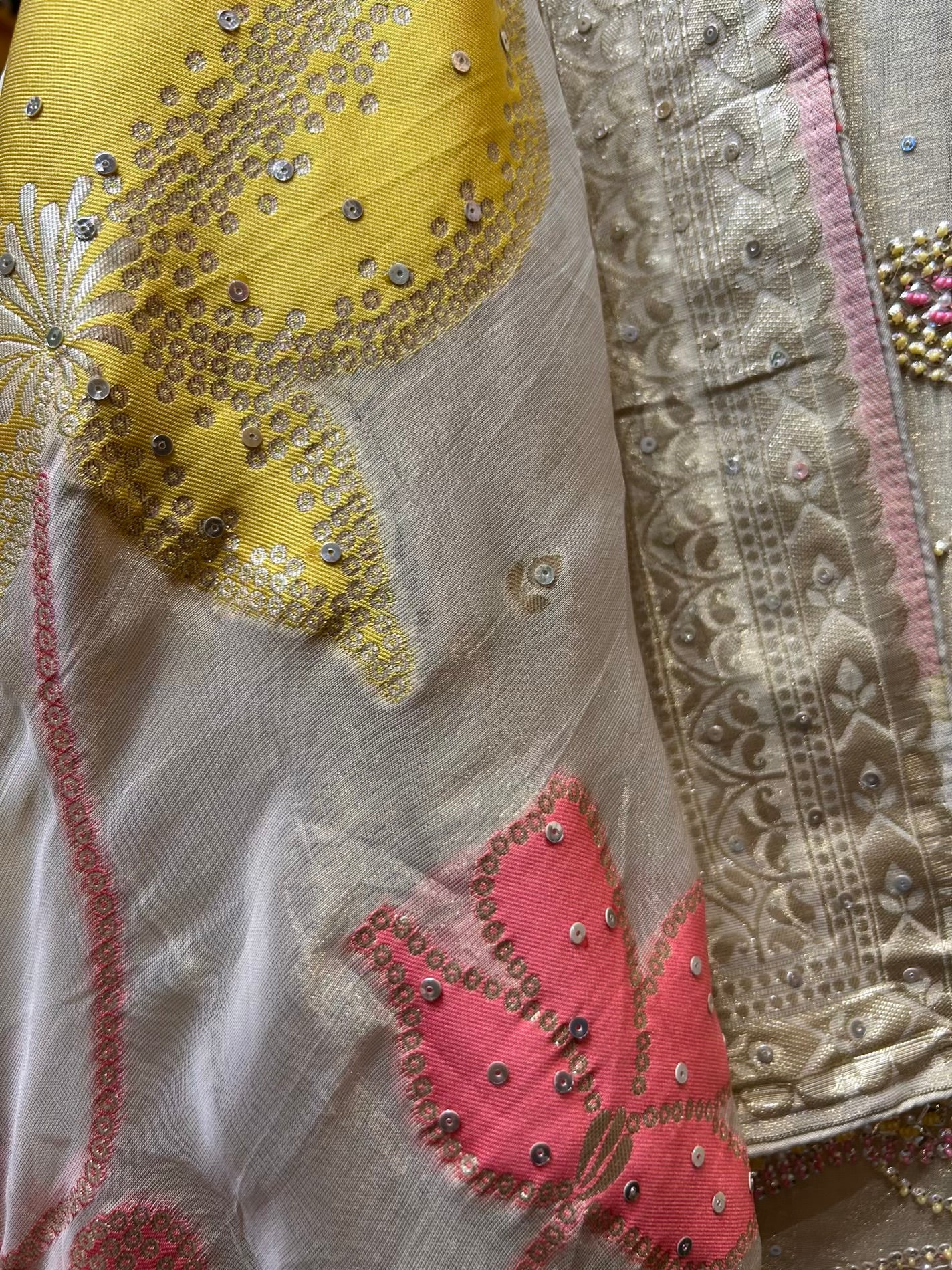 An ode to delicate craftsmanship, Sitara-e-Zar blends shimmer and artistry into timeless elegance. The organza suit, adorned with moti, cut dana, sequins, and pulse work, glimmers with a celestial charm. Paired with a Banarasi organza dupatta that carries its own regal flair and a lustrous silk bottom, this ensemble is crafted for celebrations that demand luxury with grace.
