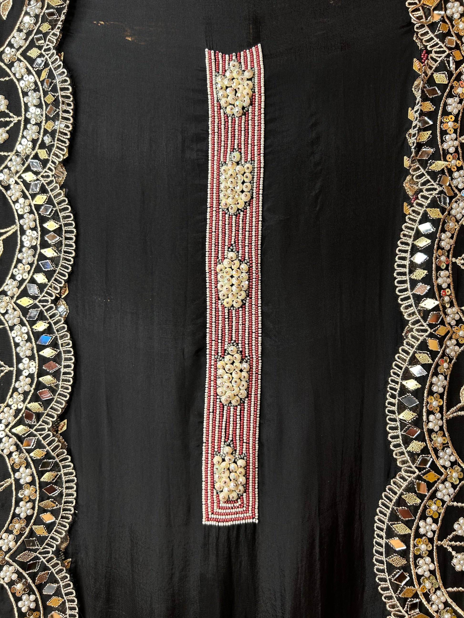 The neckline dazzles with refined hand embroidery, while the Gera features intricate Moti cutwork for a luxurious finish. -