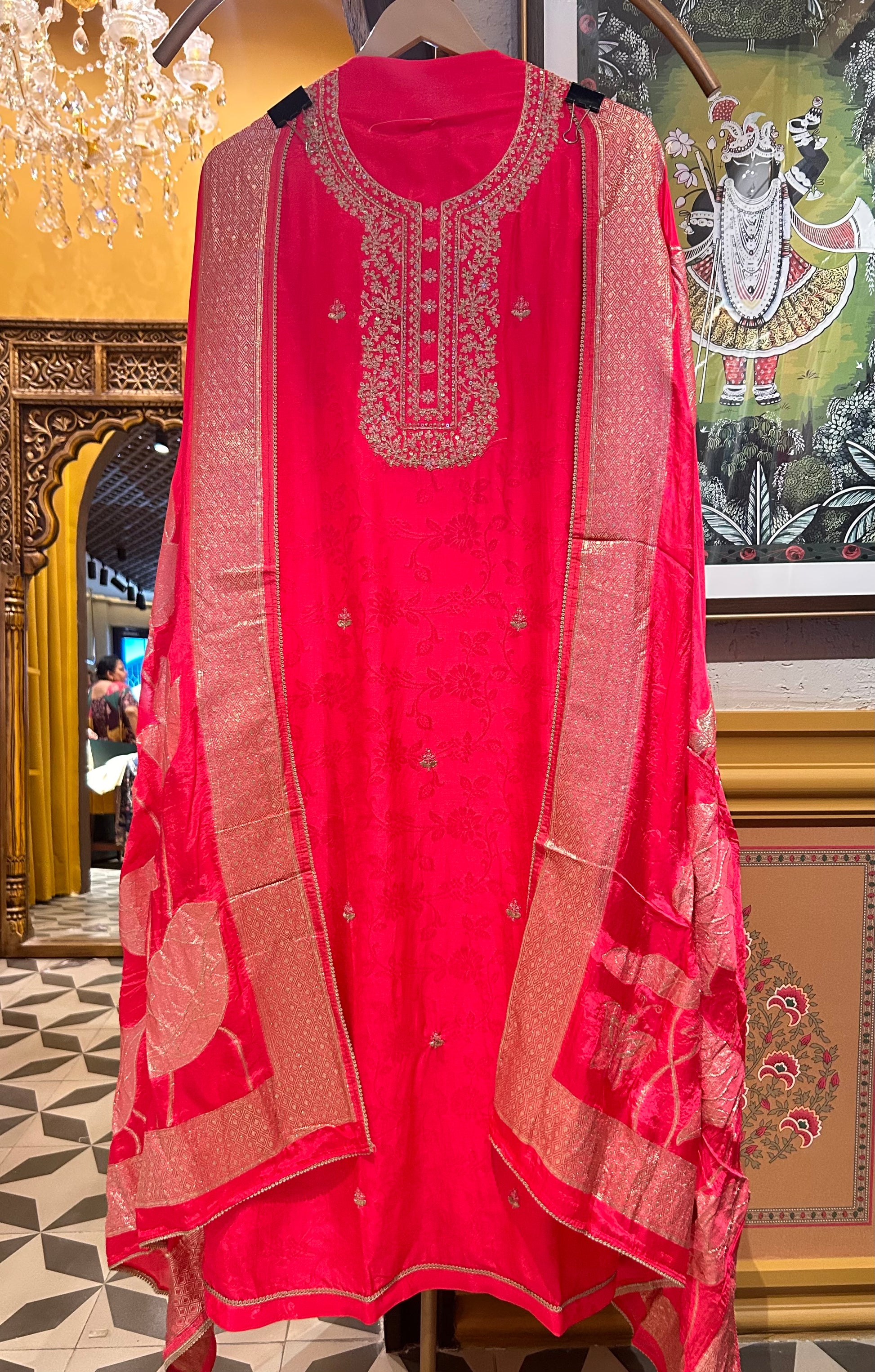 Elevate your ethnic wardrobe with Sunehri Raah, a Banarasi silk ensemble that blends richness with tradition — perfect for occasions that call for understated grandeur.
