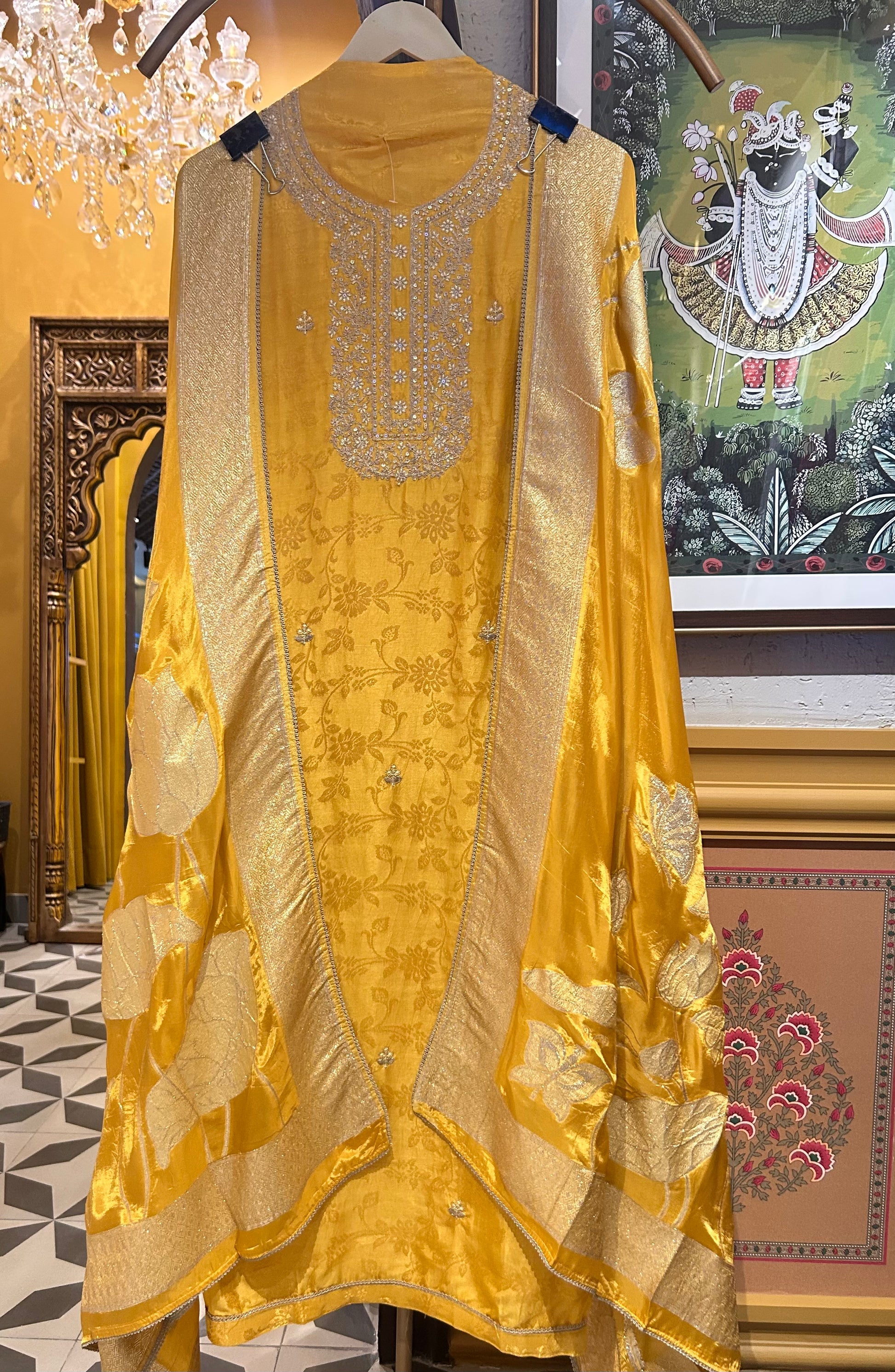 Elevate your ethnic wardrobe with Sunehri Raah, a Banarasi silk ensemble that blends richness with tradition — perfect for occasions that call for understated grandeur.