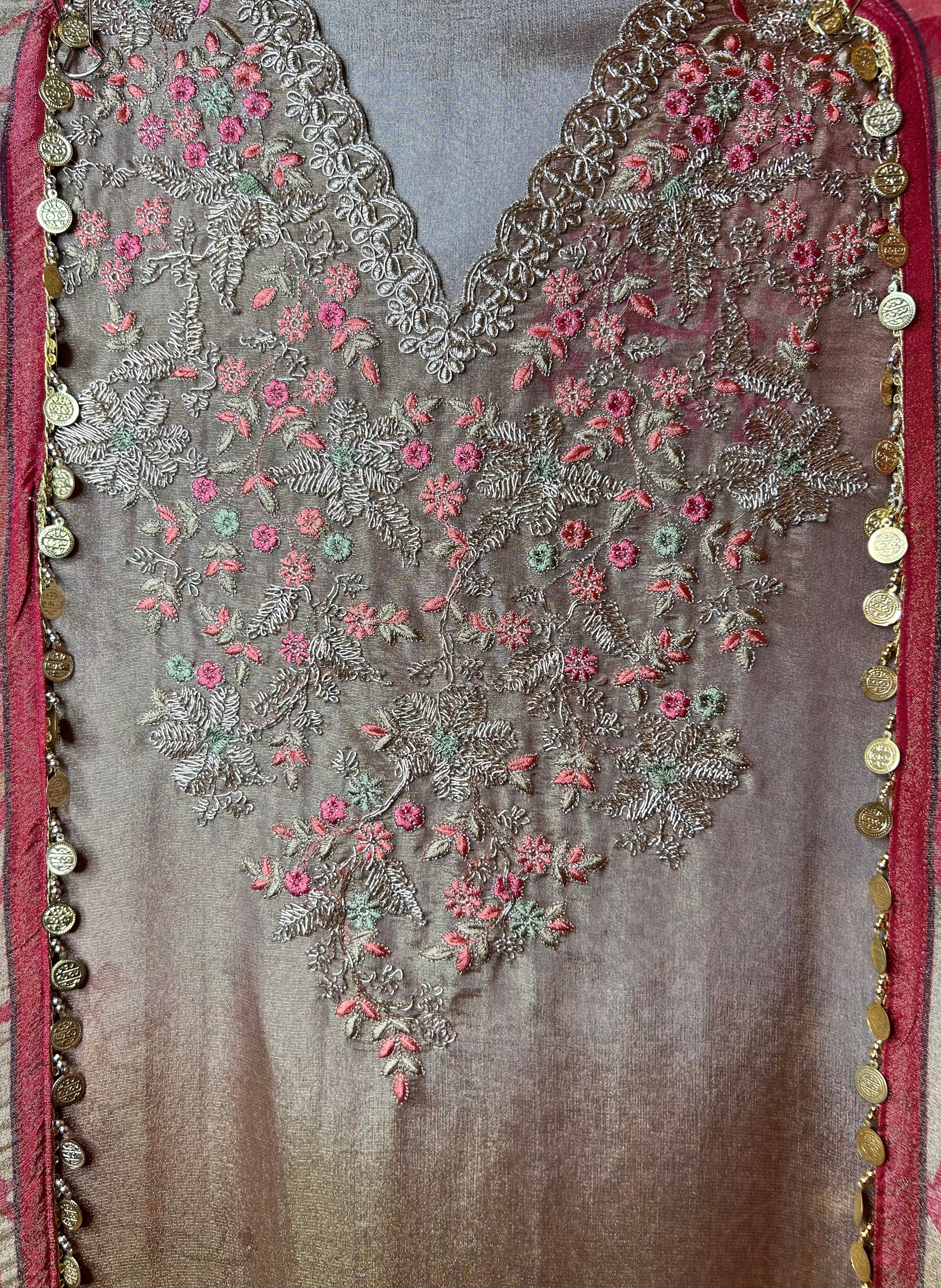 A lightweight organza base featuring detailed thread and zari work along the neckline. Its natural sheen and intricate accents lend the piece an ethereal presence, perfect for day-to-dusk elegance.